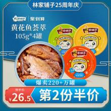 • 第二份半价鲜美黄花鱼罐头4罐,爆卖220+罐!吃超下饭的鱼罐头,必选中国罐头十强企业~林家铺子鱼罐头!甄选渤海野生黄花鱼,鱼骨酥软,不用吐刺,鲜香浓郁不油腻,香酥,香辣通通有!4罐装,只要16.5!速抢!