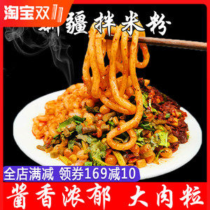 新疆炒米粉是一道新疆本地的名小吃。这款鸡肉/牛肉拌米粉是新疆塔城地区沙县的特色食品,使用较粗有嚼劲的米粉,搭配酸缸豆、黄金豆、安集海辣椒、汤汁配料,颜色浓郁,香辣爽口。