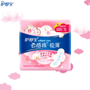 护舒宝(whisper),美国宝洁公司的一个女性保健用品品牌。自1991年进入中国以来,护舒宝一直致力为中国女性提供优质的日用护理产品。此款云感棉超净棉透气日用装,柔软舒适,双向呼吸孔,透气舒爽,不会感到闷热。规格:240mm 16片。