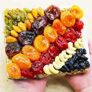 这款切糕的制作,首先把刚新鲜采摘含糖量达30%的甘甜葡萄榨汁,在115摄氏度下熬煮4小时,把90公斤葡萄汁浓缩成30公斤糖浆;然后将腰果、杏脯、圣女果干、核桃仁、无壳南瓜子仁、绿葡萄干、黑加仑葡萄干、葡萄干、蔓越莓干、葵花籽仁、巴旦木等多种坚果放入,最后凝干成型分割好即可。