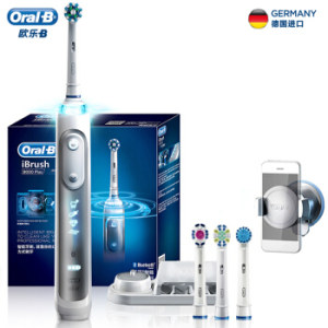 Oral-B iBrush8000系列是欧乐-B于2016年上半年推出的新款旗舰电动牙刷,在上一代旗舰Oral-B 7000系列,在智能交互方面更进了一步,搭载Position Detection技术,将附件中的吸盘支架吸在卫生间的镜子上,把手机夹在支架上,通过手机摄像头识别并配合电动牙刷角度识别,可在App中显示正在清洁的牙齿部位及清洁进度,从而统计每天的刷牙情况。牙刷方面,依然采用了3D清洁技术,震动+旋转配合,先通过震动来松动牙菌,再通过旋转将其扫走。配有6种清洁模式:普通清洁模式、敏感情节模式、按摩清洁模式、美白模式、舌苔清理、以及专业清理模式,可满足各种清洁需求。牙刷机身配有一圈多彩指示灯,可通过颜色变化来显示清洁压力、刷牙时间、蓝牙连接状态等,同时也可自定义各种功能的颜色显示(共12种颜色可选)。充电一次可使用12天。此外还配有4枚刷头