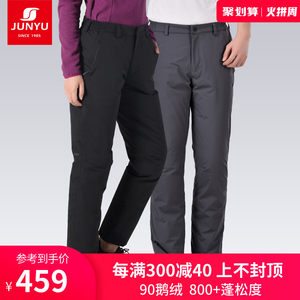 君羽雪巅男女加厚羽绒裤,填充800蓬90%鹅绒,男L码充绒量103克/女M码充绒量82克,属于中等厚度,防水阻渗透的压胶防绒面料,适合0℃到-15℃穿着。