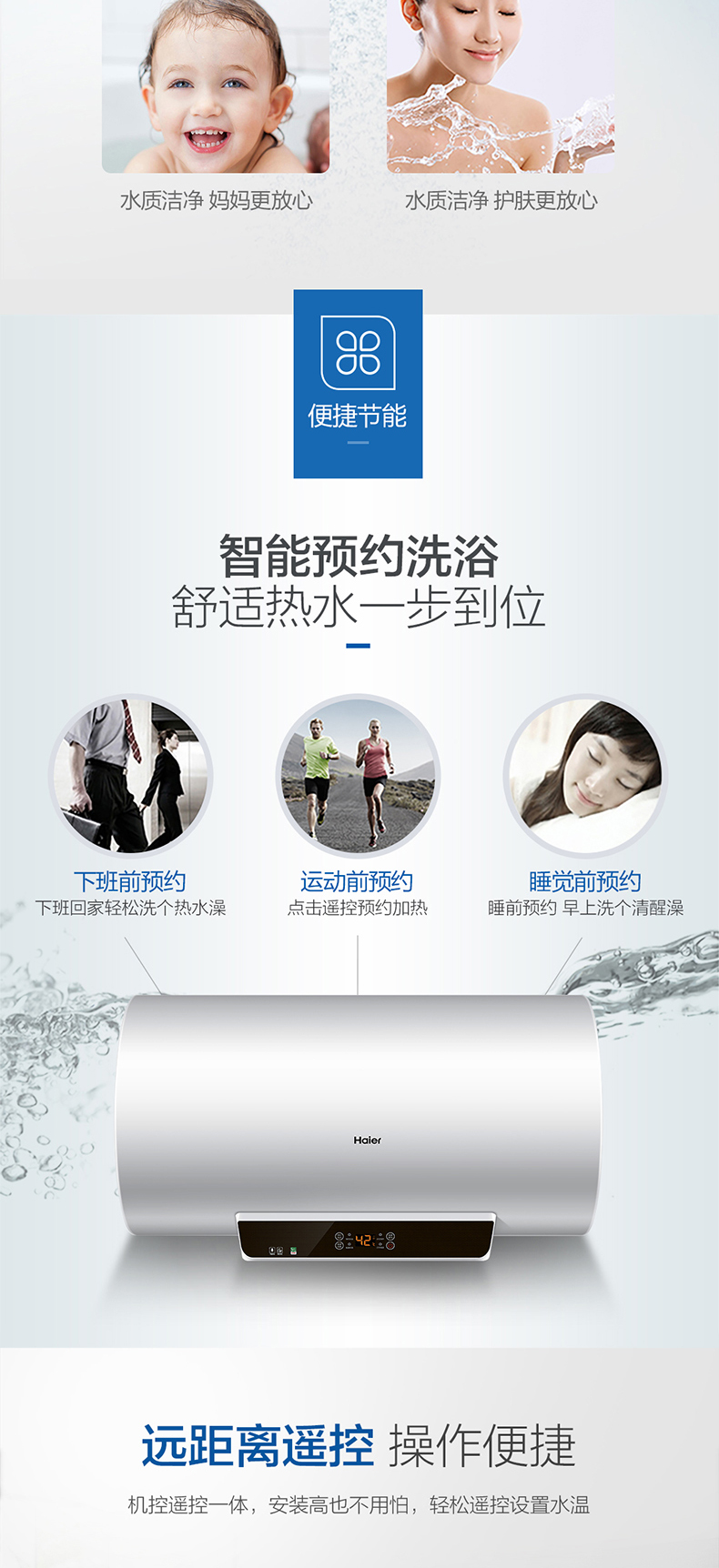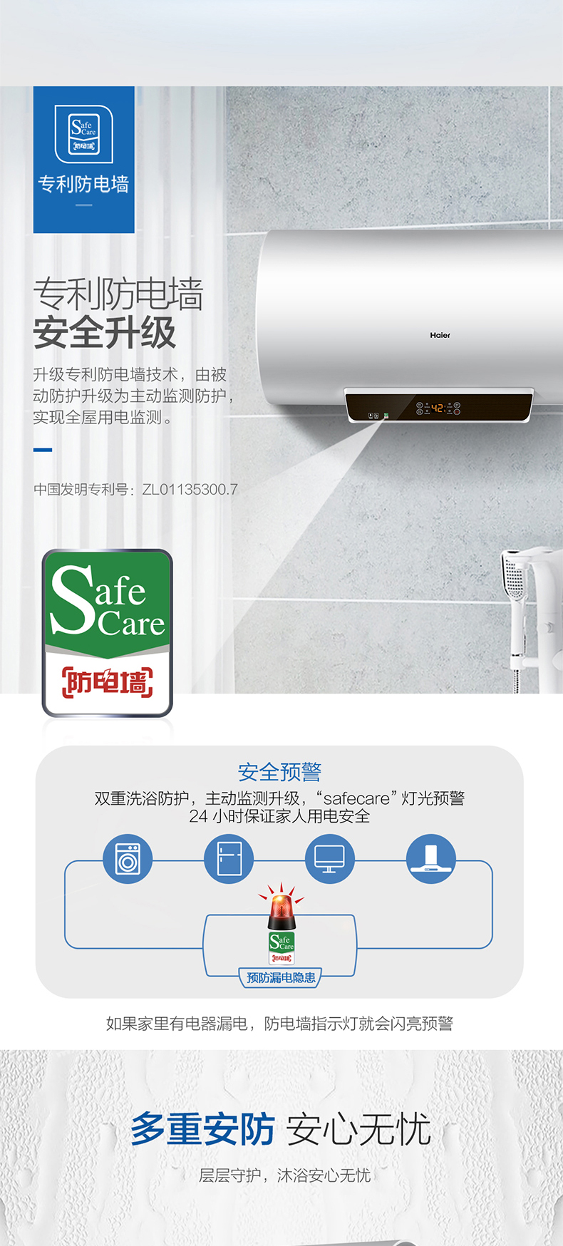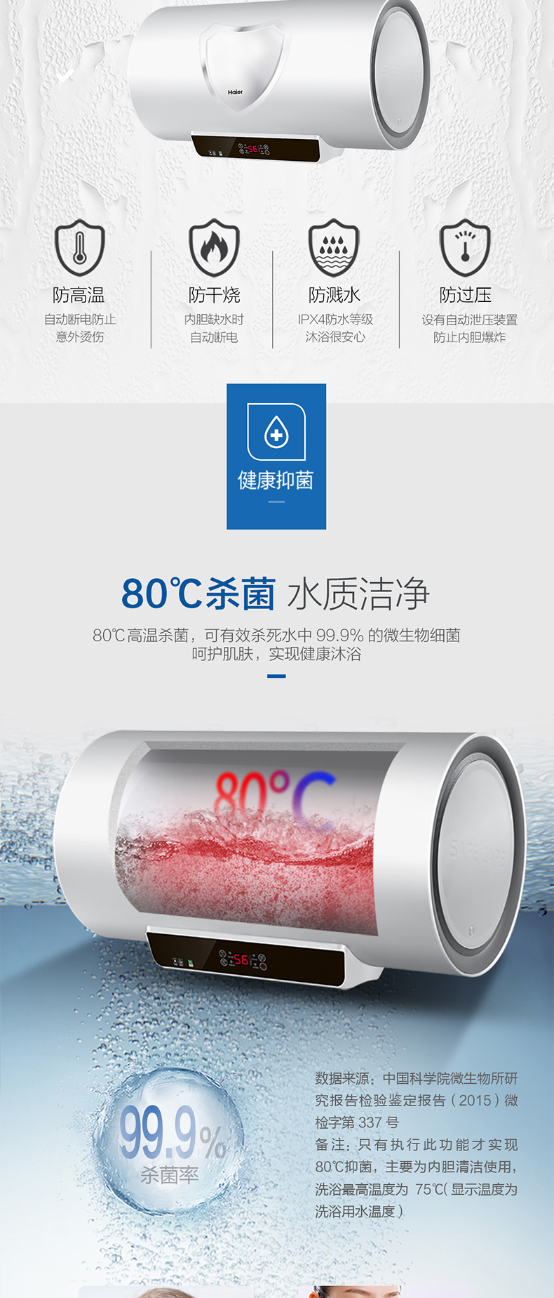 专利防电墙技术,主动监测防护,实现全屋用电监测,24小时保证家人用电安全,防高温,防干烧,防溅水,防过压,全方面保护家人安全。80℃高温杀菌,可有效杀死水中99.9%的细菌,保证水质健康,呵护肌肤。为方便操控,采用了LED显示屏+遥控器的操作方式,具备智能预约,使用起来更加方便。为国家一级能效标准,