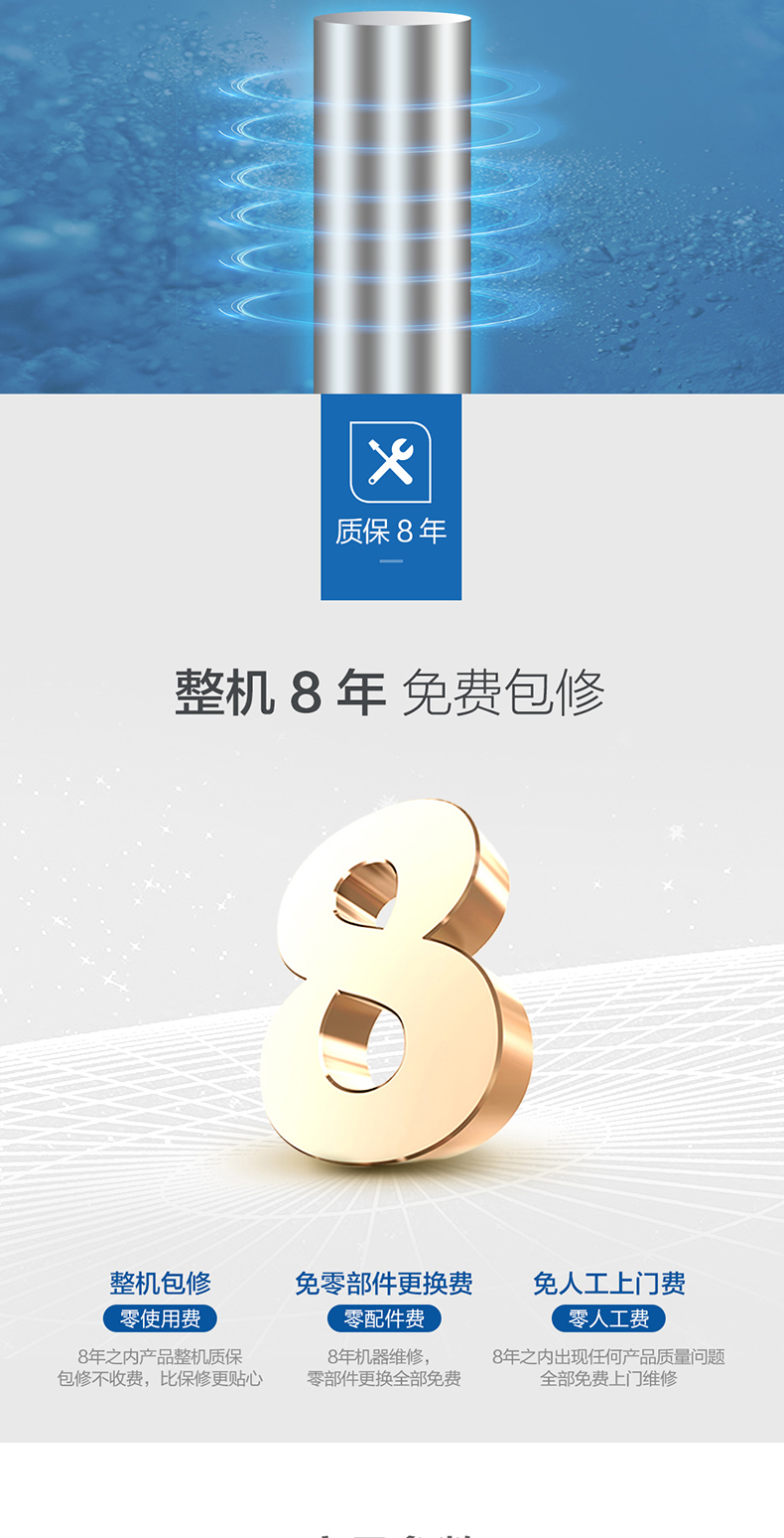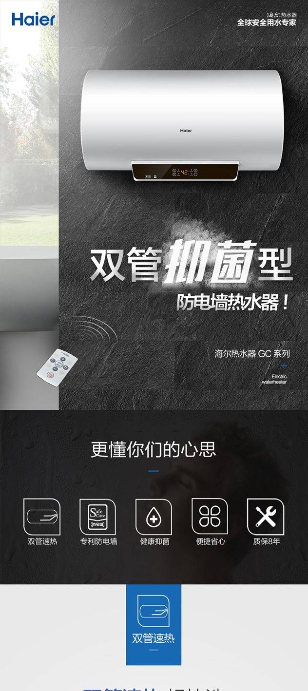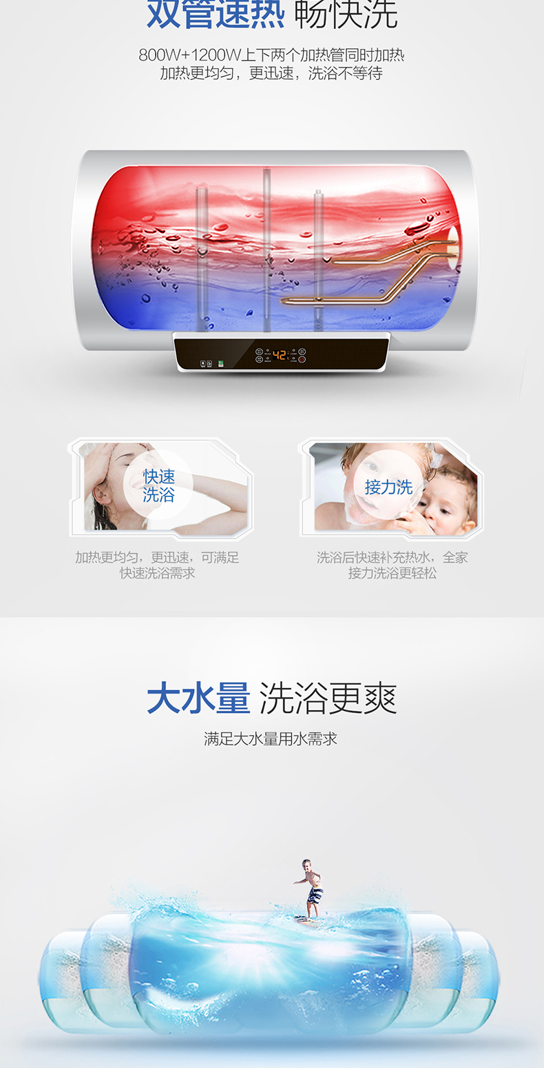 专利防电墙技术,主动监测防护,实现全屋用电监测,24小时保证家人用电安全,防高温,防干烧,防溅水,防过压,全方面保护家人安全。80℃高温杀菌,可有效杀死水中99.9%的细菌,保证水质健康,呵护肌肤。为方便操控,采用了LED显示屏+遥控器的操作方式,具备智能预约,使用起来更加方便。为国家一级能效标准,