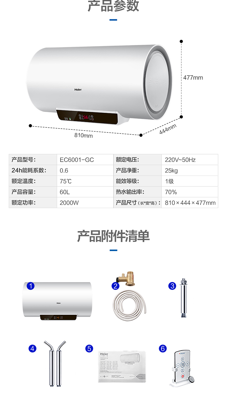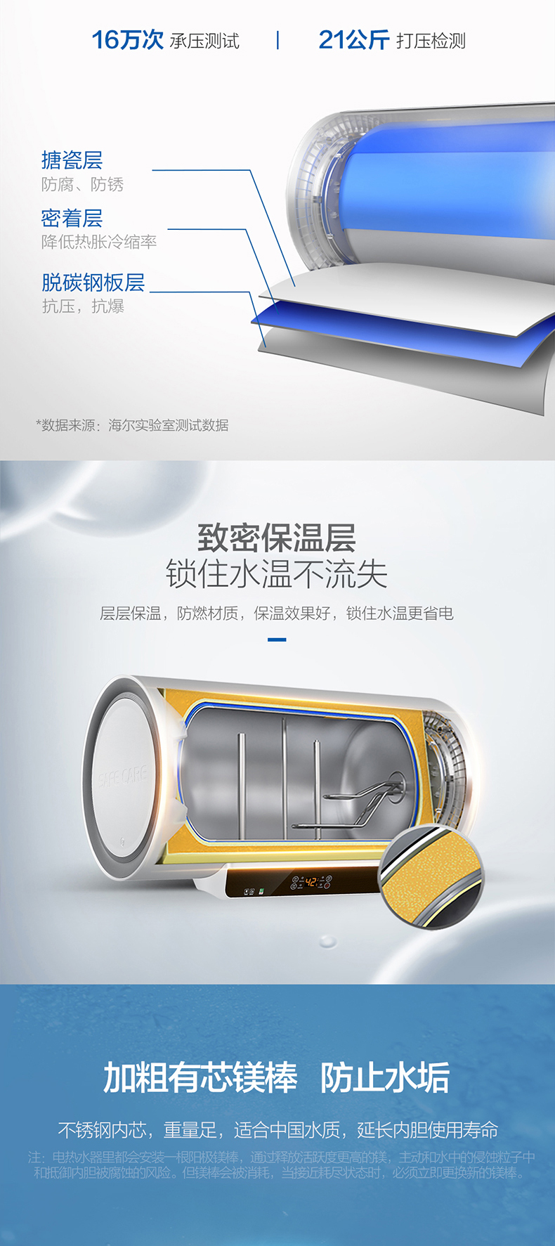 海尔这款型号为EC6001-GC的电热水器,容量为60升,800W+1200W上下双加热管加热,有效增大胆内受热面积,加热更均匀,更迅速,实现热水速出,满足全家人的洗浴需求。采用专利金刚三层胆,有效抗溶、抗酸,提升内胆使用寿命。内有加粗有芯镁棒,防止水垢,但是镁棒会消耗,需要更换。