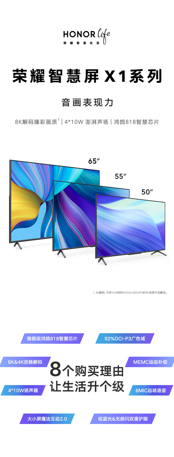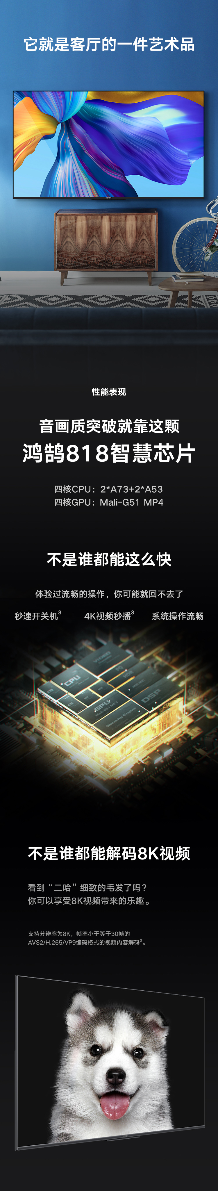 搭载鸿蒙818处理器,采用四核CPU+四核 GPU的架构,能够做到秒唤醒,秒开机。配备独立Video Decoder解码模块,支持流畅播放8K视频