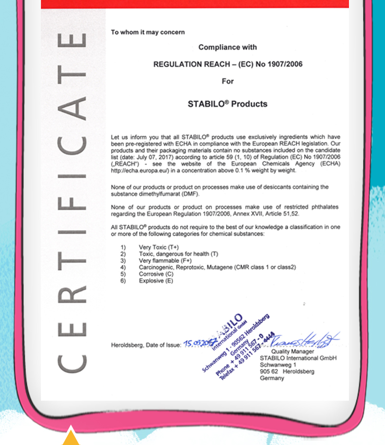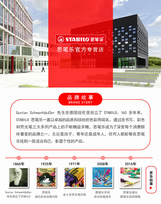 德国STABILO/思笔乐,是全球最大的生产和销售书写文具品牌之一,于1855年成立于纽伦堡,在欧洲享有150年的盛誉,书写用具包括荧光笔、圆珠笔、水笔、铅笔、彩色铅笔、水彩笔等。其中备受追捧的书写产品可大致分为:荧光笔系列、书写笔系列、彩色笔系列三个大类。