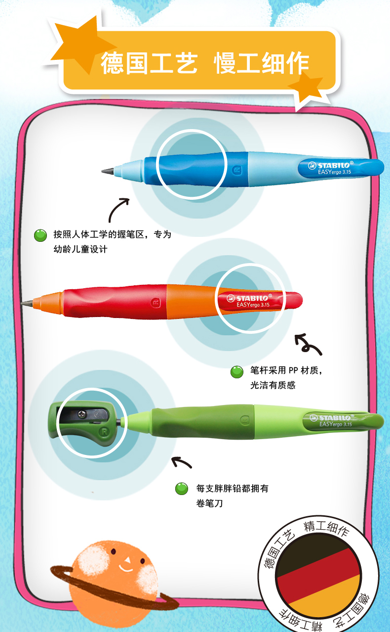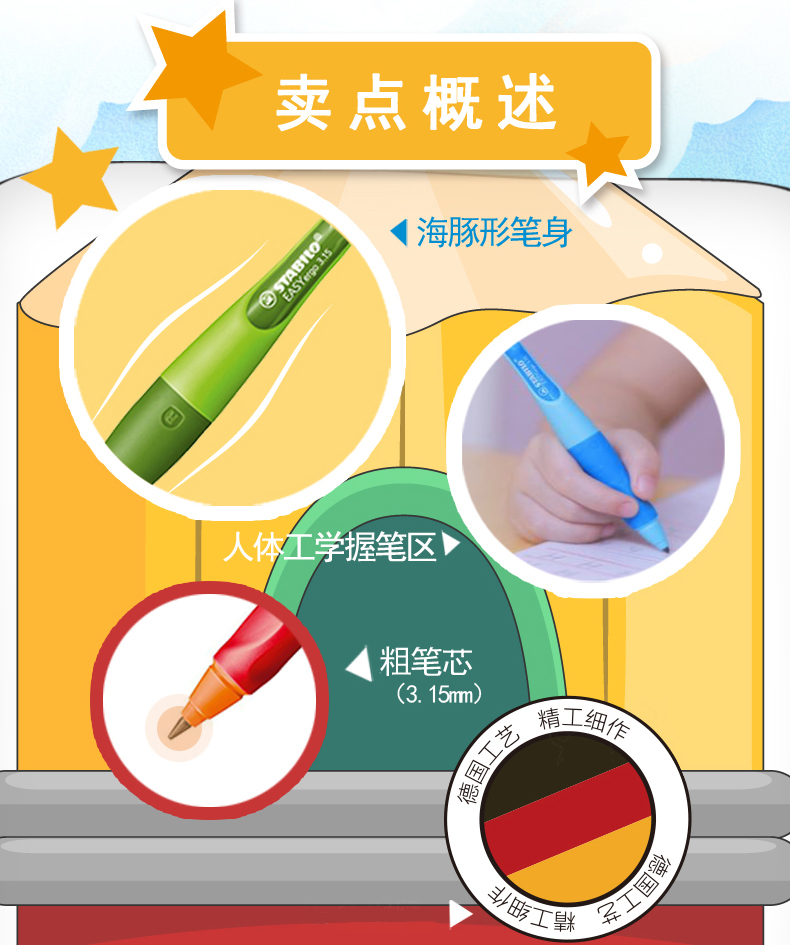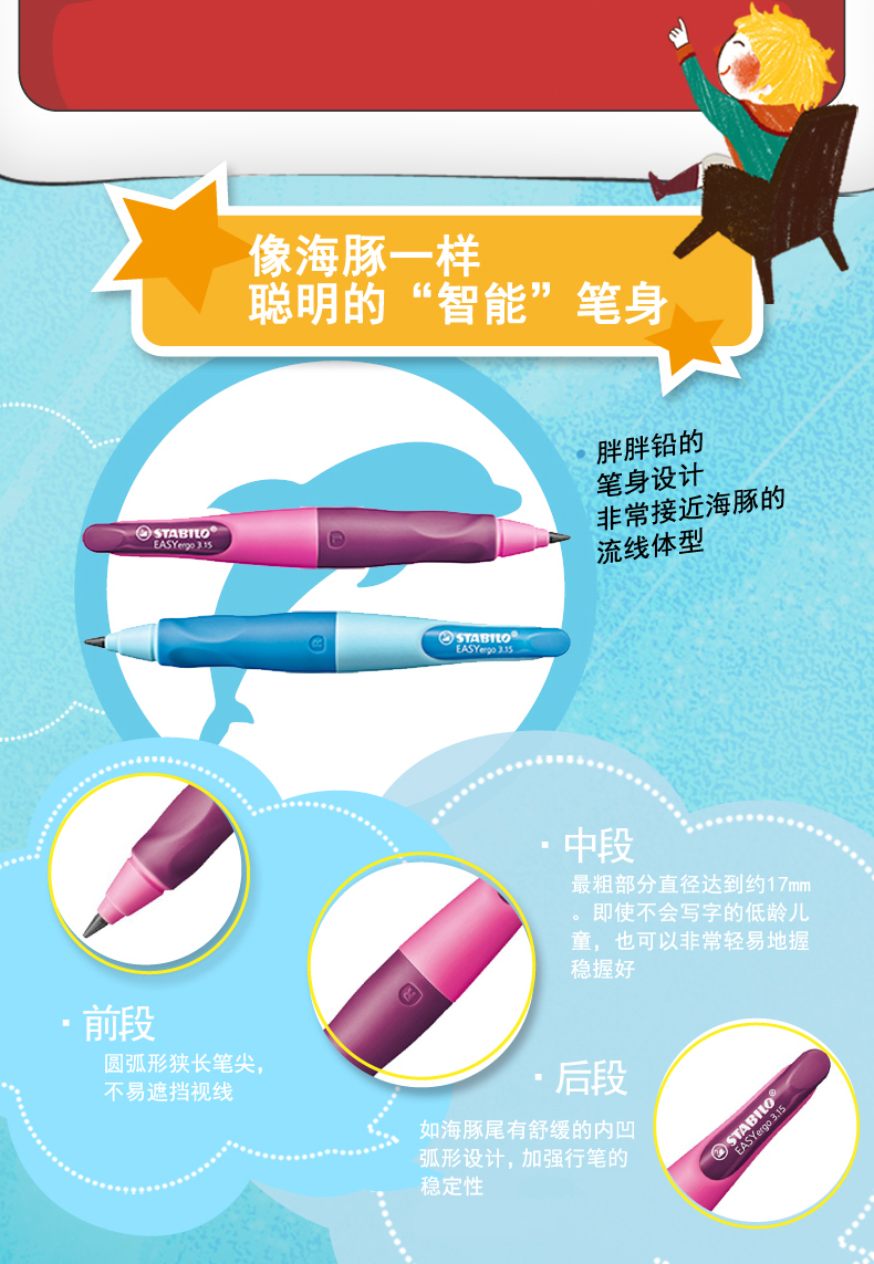 考虑到儿童的特点,采用海豚形笔身,大尺寸握笔区域人体工程学设计,既能正确引导了正确的握笔姿势,有降低了准备抓握的难度,选用比普通橡胶更柔软的TPE材质,保护孩子柔嫩小手,长时间书写不易疲劳。