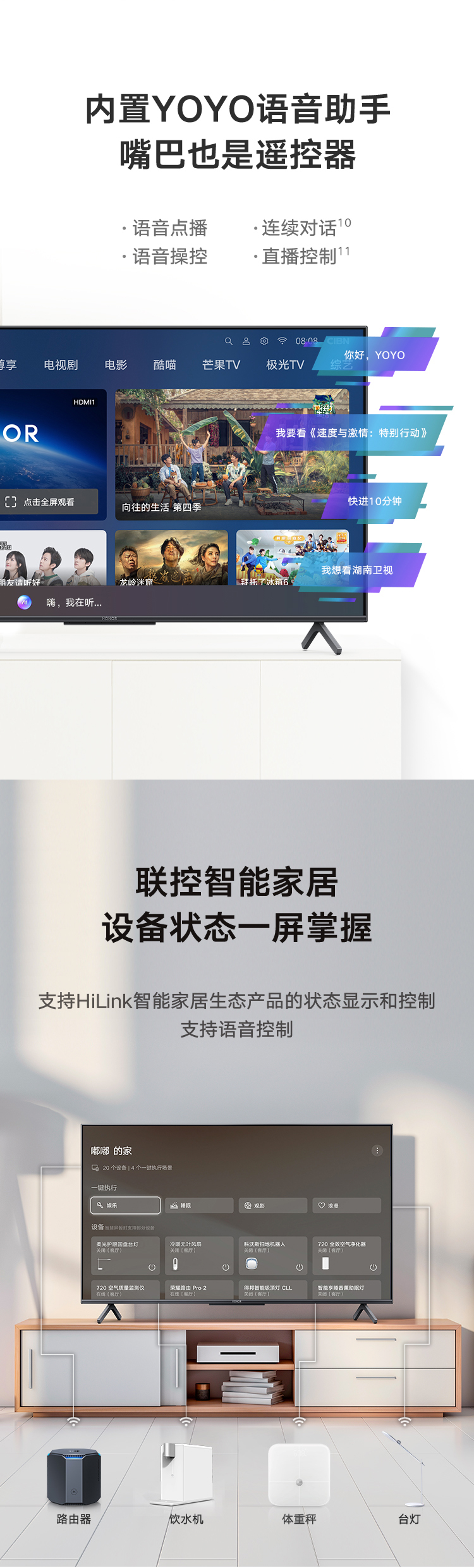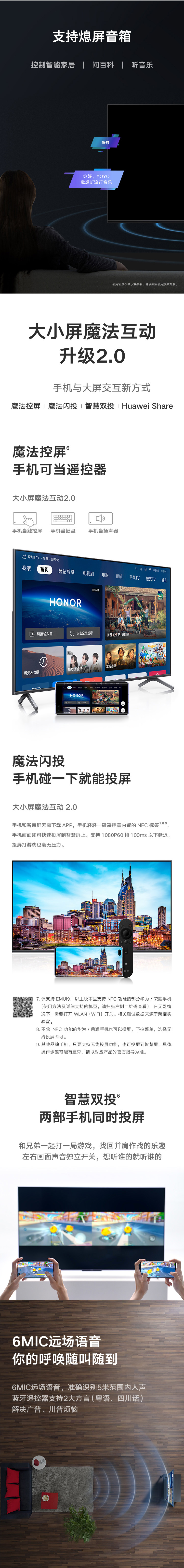 内置全新大小屏魔法互动2.0技术,可用手机充当电视的触屏、键盘、扬声器,新增智慧双投功能,可以同时投影两部手机的内容,左右分屏,声音独立开关。内置6麦克风远场语音,可识别5米以内的人声。