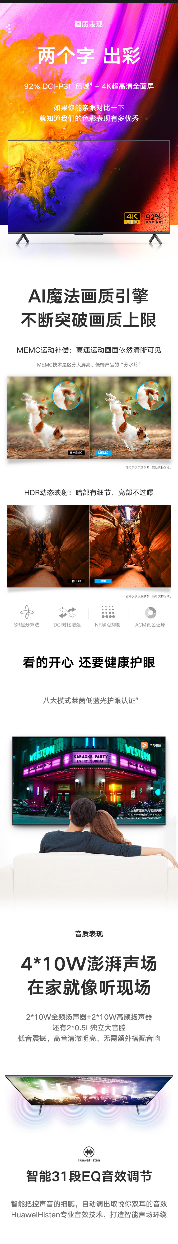 配备了4*10W扬声器,整体音腔体积达到1L,具备HUAWEI Histen五大音质技术,低音表现浑厚有力,中音饱满,高音清澈明亮。