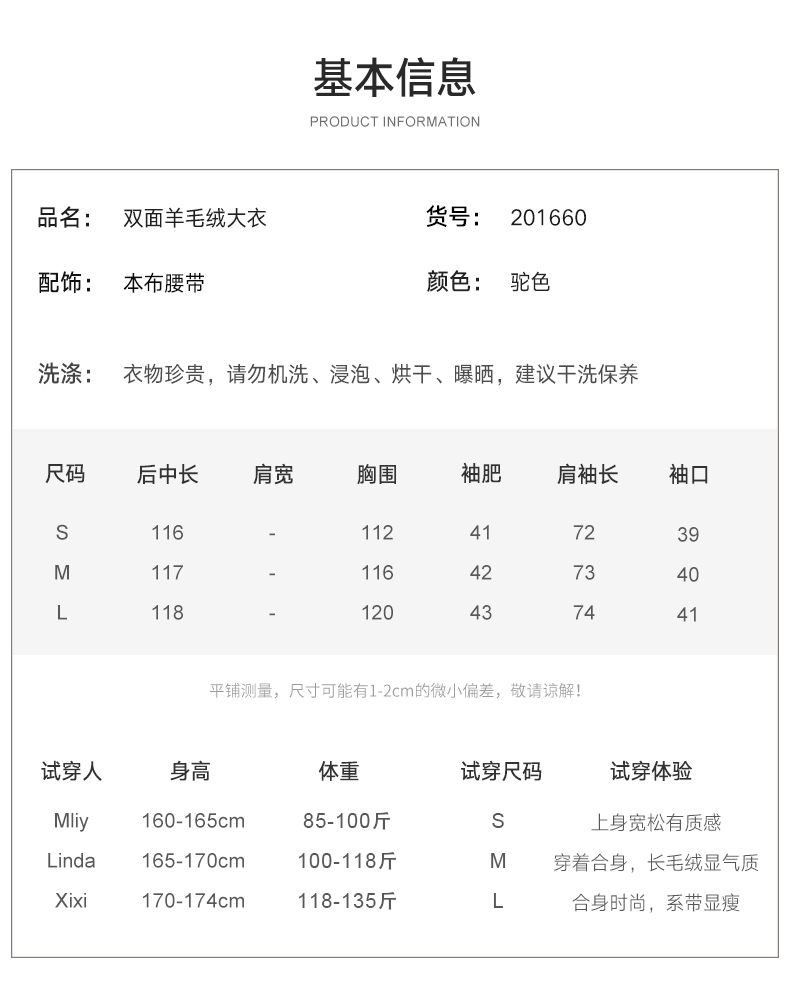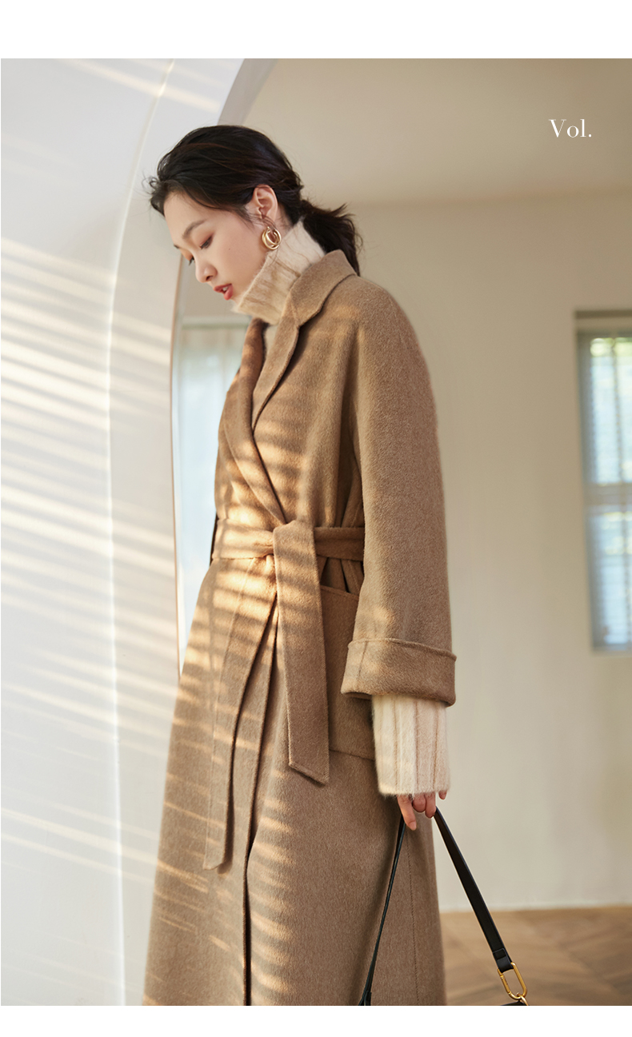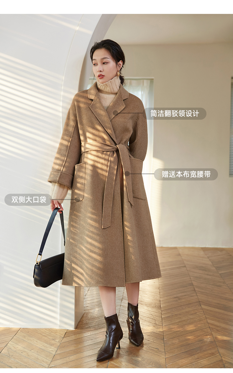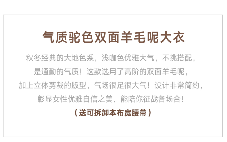 轻奢简约风格,收腰腰带更显修身,面料松软糯滑,秋冬经典的驼色,优雅大气不挑搭配,符合日常通勤气质,立体剪裁版型,彰显女性优雅自信之美,通勤休闲等时尚百搭。