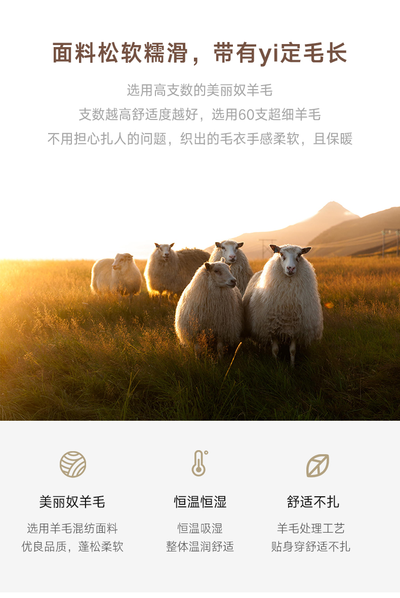 这款是原创设计师品牌,面料采用80%澳洲进口美利奴羊毛,「美利奴羊毛」也称美丽诺,英文Merino,是逆天的天然纤维,比羊毛保暖,却轻暖不扎人,纤细弯曲的结构透气极好,能吸收大量水蒸气并快速挥发,是最优的天然吸湿快干纤维,还随着体温变化而做出反应,让穿着的人在寒冷时感到温暖,炎热的时候感到凉爽。美利奴羊毛还含角质蛋白,可以抑制细菌滋生,抑菌除臭。