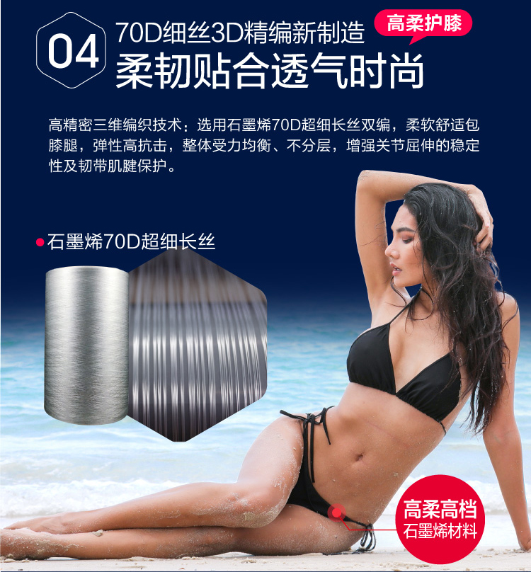 这款益力维 石墨烯远红外护膝 ,拥有四项专利认证,高端定制,选用新型石墨烯纳米材料,高密度三维编织技术,选用石墨烯70D超细长丝双编,柔软舒适,高强度高弹力,整体受力均匀,不分层,增强关节屈伸稳定性及韧带肌腱保护,护膝纱线中富含负离子远红外,可以促进循环,排酸减疲,驱寒除湿等,养护关节;