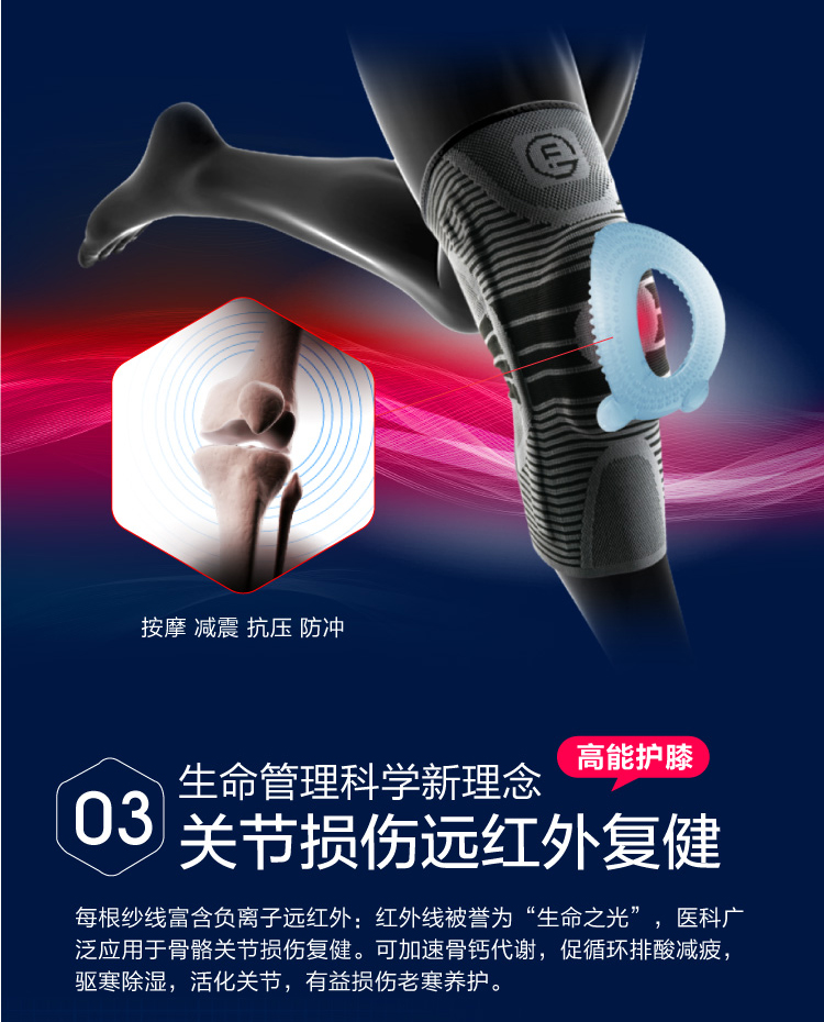 美国FDA标准,专业运动防护,适合关节损伤复健、重体力劳作防护、运动健身防护等。这款护膝髌骨部分采用高弹热塑衬垫,减震抗冲击,两侧韧带高弹支撑条,避免韧带损伤,远红外负离子有益关节,老寒腿保养等。