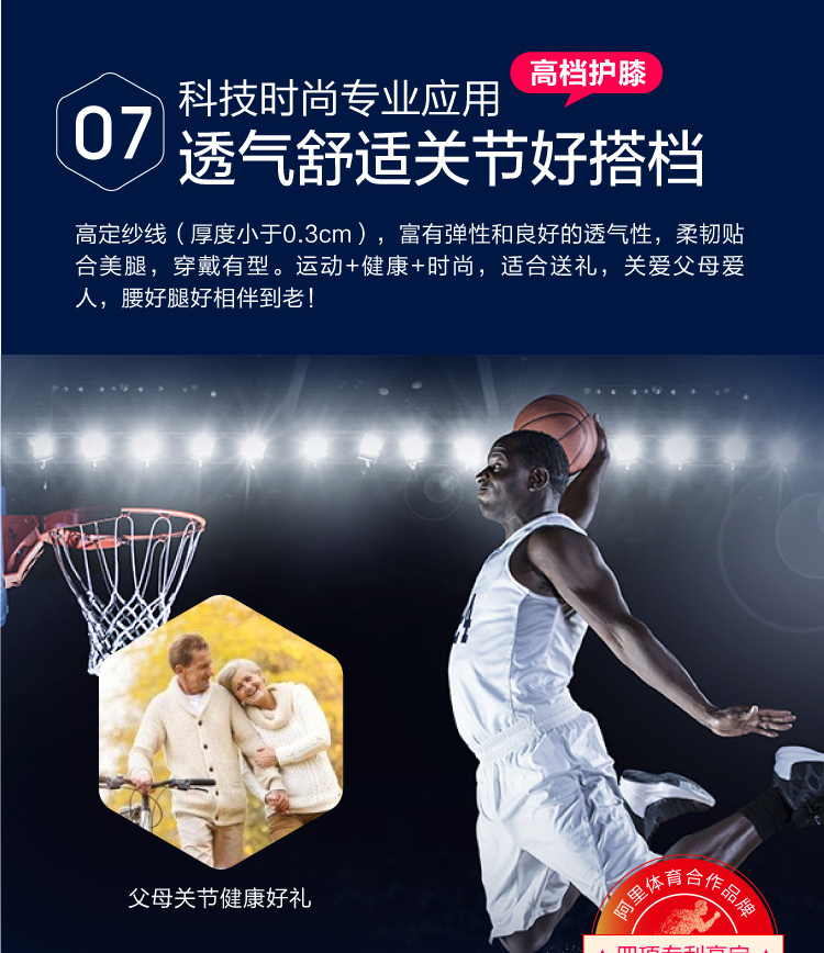 专利高弹高缓冲髌骨衬垫,保护半月板,抗冲击抗压力,减缓膝关节运动磨损,更舒适;两侧韧带肌腱支撑条,防滑减压,提高运动中的侧防能力,保护腿部肌腱韧带,减少运动损伤。
