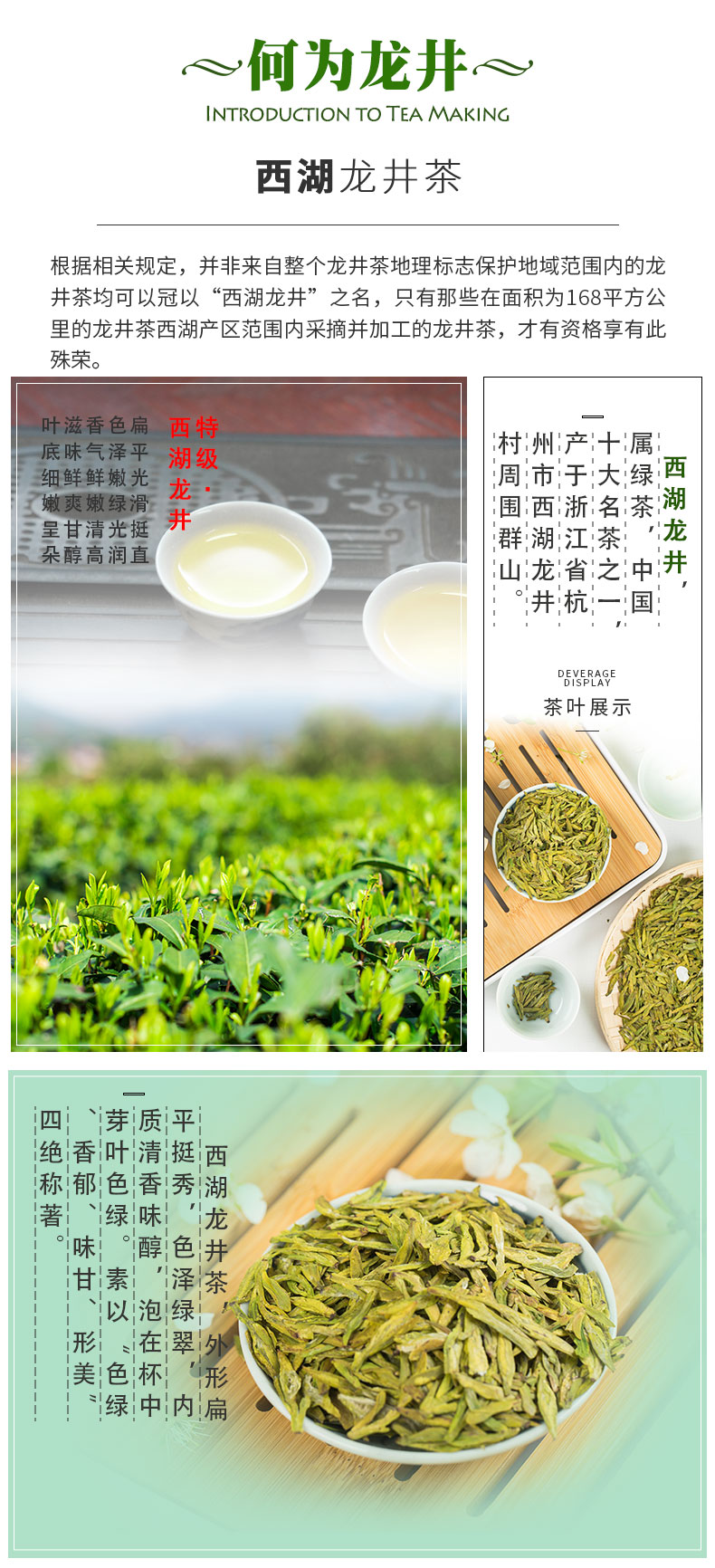 西湖龙井的产区分一级产区和二级产区,一级产区包括传统的“狮(峰)、龙(井)、云(栖)、虎(跑)、梅(家坞)”五大核心产区;由于清明前气温普遍较低发芽数量有限,生长速度较慢,能达到采摘标准的产量很少,所以又有“明前茶,贵如金”之说。