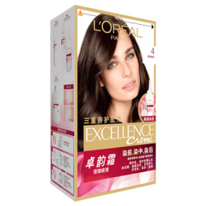 L'OREAL PARIS巴黎欧莱雅卓韵霜赋活养护染发霜从评论来看对头发的伤害性比较小,染发的同时有一定的护发效果,上色均匀,颜色饱满。内包含修护精华1支12ml,护发染发霜1支48ml,显色敷用剂1瓶72ml,护发乳1瓶40ml,上色梳一个,染发手套一副。