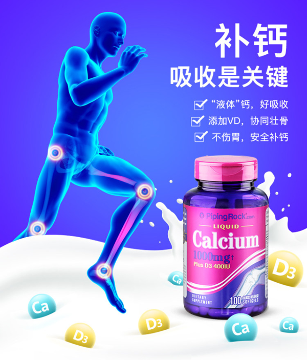 成年人腰酸背痛、老年人骨质酥松,都是缺钙的表现,都可服用此液体钙软胶囊,可强健全身骨骼;每粒液体钙软胶囊,每份(3粒)含量:钙1000mg、维生素D3 USP 400IU;成人每日3粒,建议随餐食用,孕妇和正在服药者先咨询医生,规格是100粒。