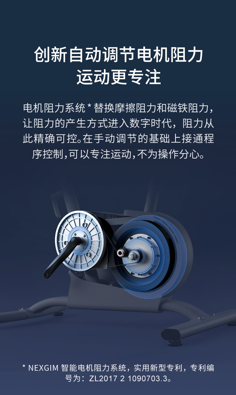2.阻尼,使用智能电机阻尼系统来替代传统机械阻力(摩擦阻力或磁铁阻力),可以通过数字变化来精确调节阻尼的大小,满足用户的需求。(NEXGIM智能电机阻力系统,实用新型专利,专利编号为: ZL2017 2 1090703.3)