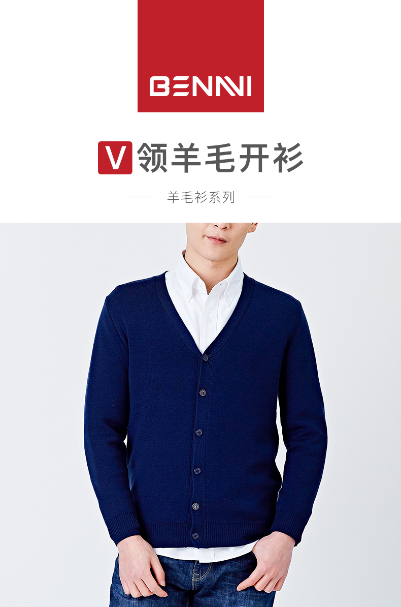 本米男V领羊毛开衫,采用100%澳大利亚进口精纺超细美利奴羊毛,与一般羊毛制品相比,纤维更为细腻,做成面料,上身柔滑无毛刺感,是羊毛衫中的LV。