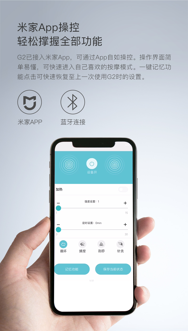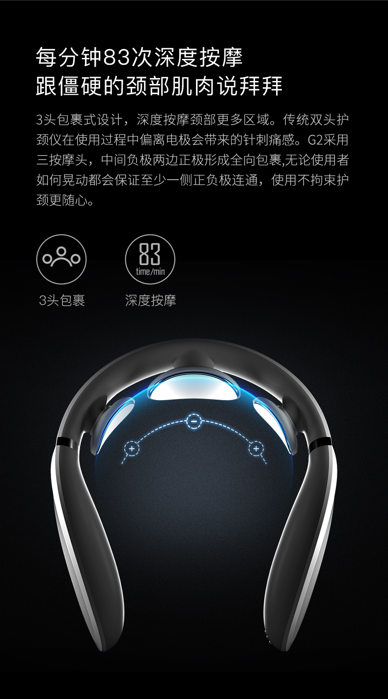 采用TENS脉冲技术利用特定频率的脉冲电流模仿手法按摩,可以模拟出揉捏、刮痧、针灸三大按摩手法,并且配合15级的力度调节,加上42°恒温热敷功能,再配合热敷,达到促进血液循环、缓解疼痛等颈部