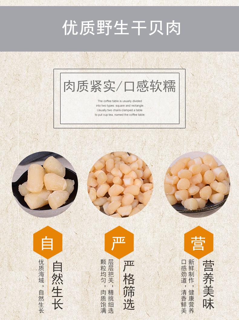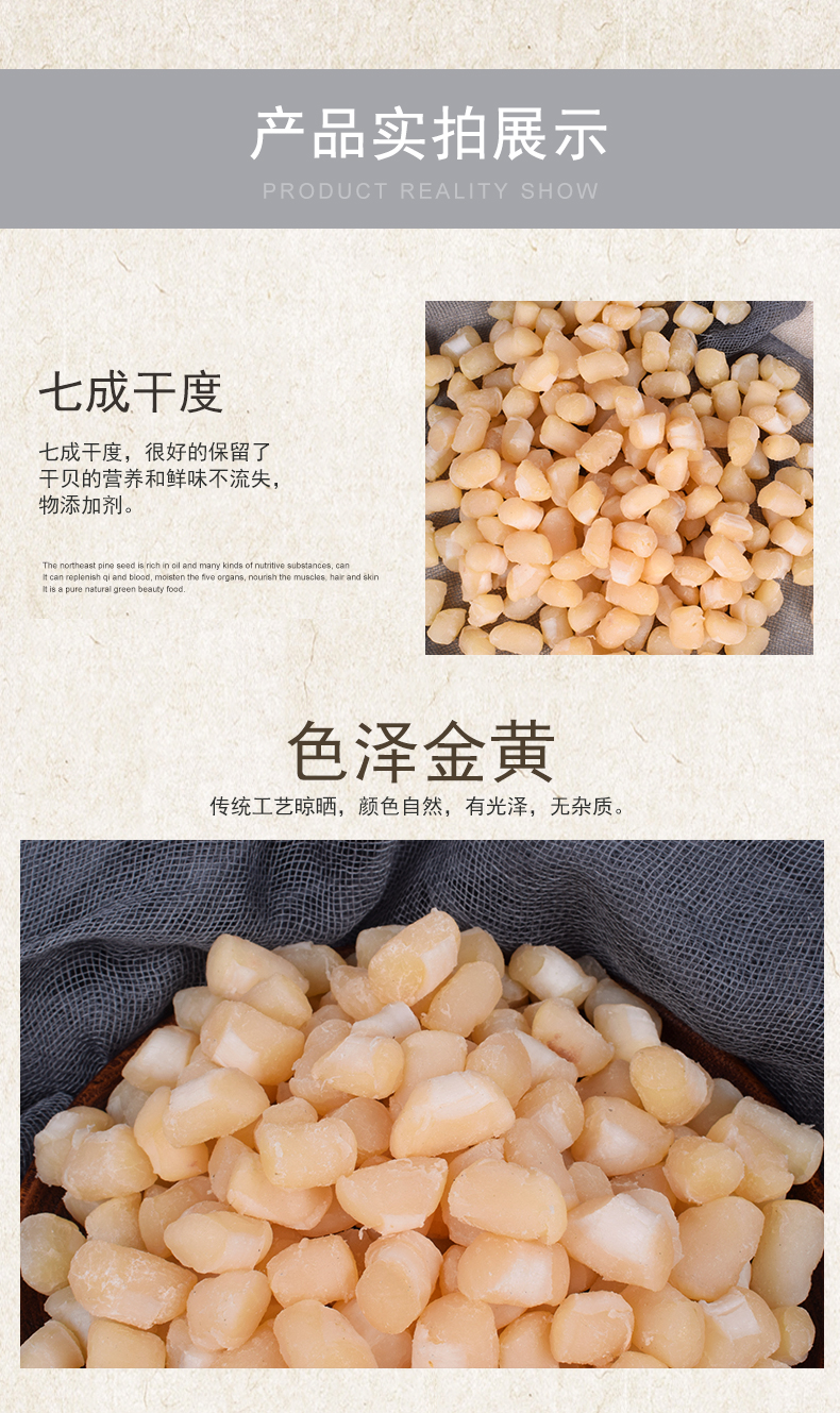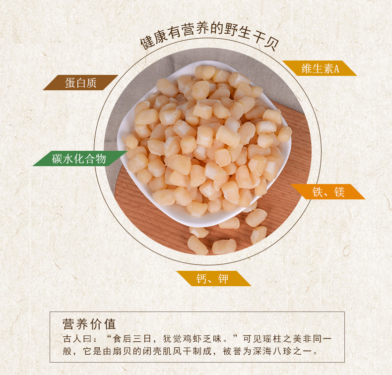 干贝营养价值非常的高,具有滋阴补肾、和胃调中功能,能治疗头晕目眩、咽干口渴、虚痨咳血、脾胃虚弱等症,常食有助于降血压、降胆固醇、补益健身。在古时是进贡皇室的珍品。领券链接点此