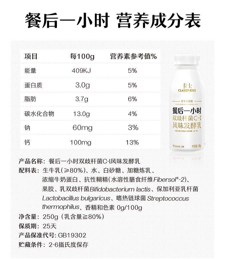 包含:餐后一小时 双歧杆菌C-I 风味发酵乳 250g*6瓶+双倍蛋白 风味发酵乳 138g*6杯。