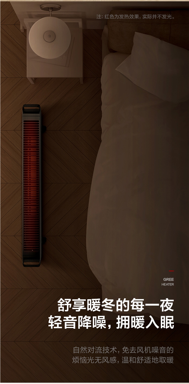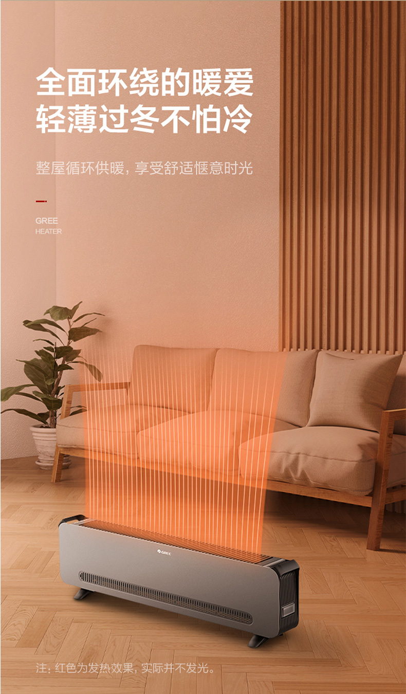 踢脚线取暖器,通过空气热对流的原理,当加热片遇上空气时,热空气将往上升,下面的冷空气又会自动补充移动后的空气,通过不断循环,可以达到恒定的温度,可以根据自己的需要放在室内任何角落,具有即开即热,升温速度快的优点,是没有暖气家庭提高冬季生活舒适度的理想选择。