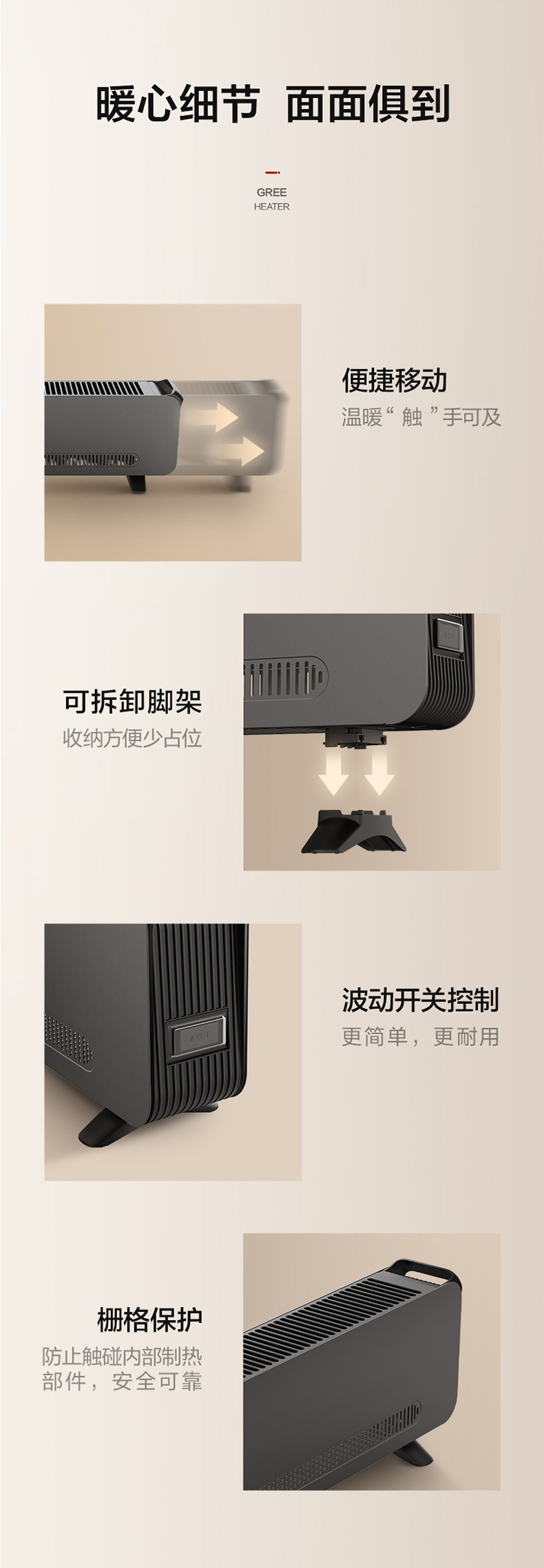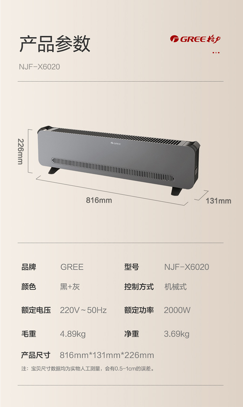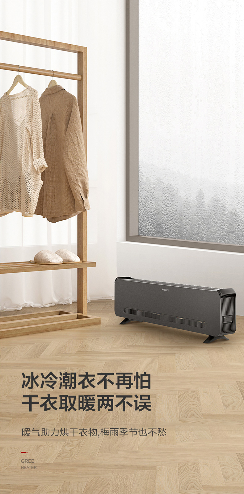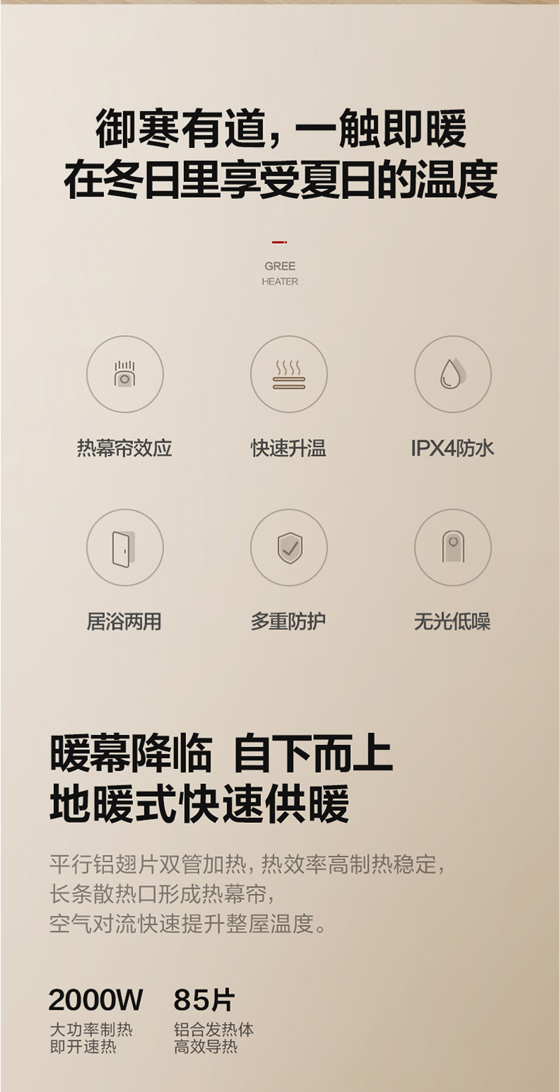 格力大品牌 踢脚线取暖器,1000W/2000W 2档速热,热幕帘效应,自下而上快速升温,冬日里地暖般舒适,采用85片铝翅片发热体,10分钟左右整屋温度明显上升,制热能力优于空调。内置平衡系统,机身倾斜30度自动断电。整机IPX4级防水,从任何角度喷溅都能防水,使用安全。
