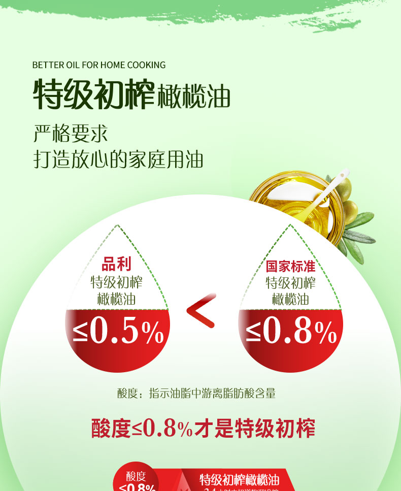 这款品利特级初榨橄榄油,西班牙原装进口,酸度≤0.5%。从酸度上来说,国际上普遍将最高等级的橄榄油(西班牙特级初榨橄榄油)的酸度定位在0.3%—0.8%之间,这个范围的橄榄油也被称作特级初榨橄榄油,酸度越低,品质越好。