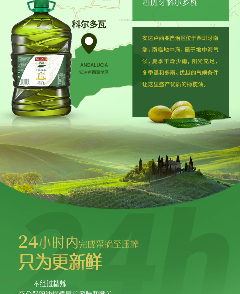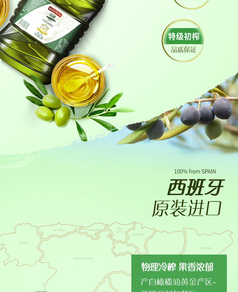 橄榄油是世界公认的高端食用油,主要原因是其单不饱和脂肪酸含量高达75%左右,为常见食用油中之最。初榨可以理解为头道油,此外初榨橄榄油一般都为冷榨工艺加工。