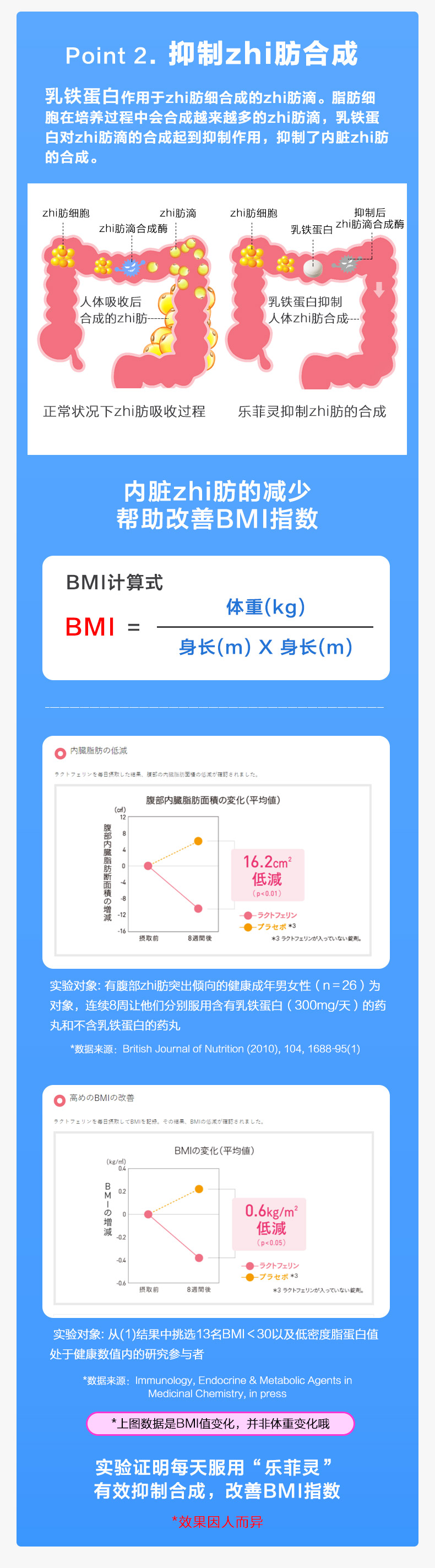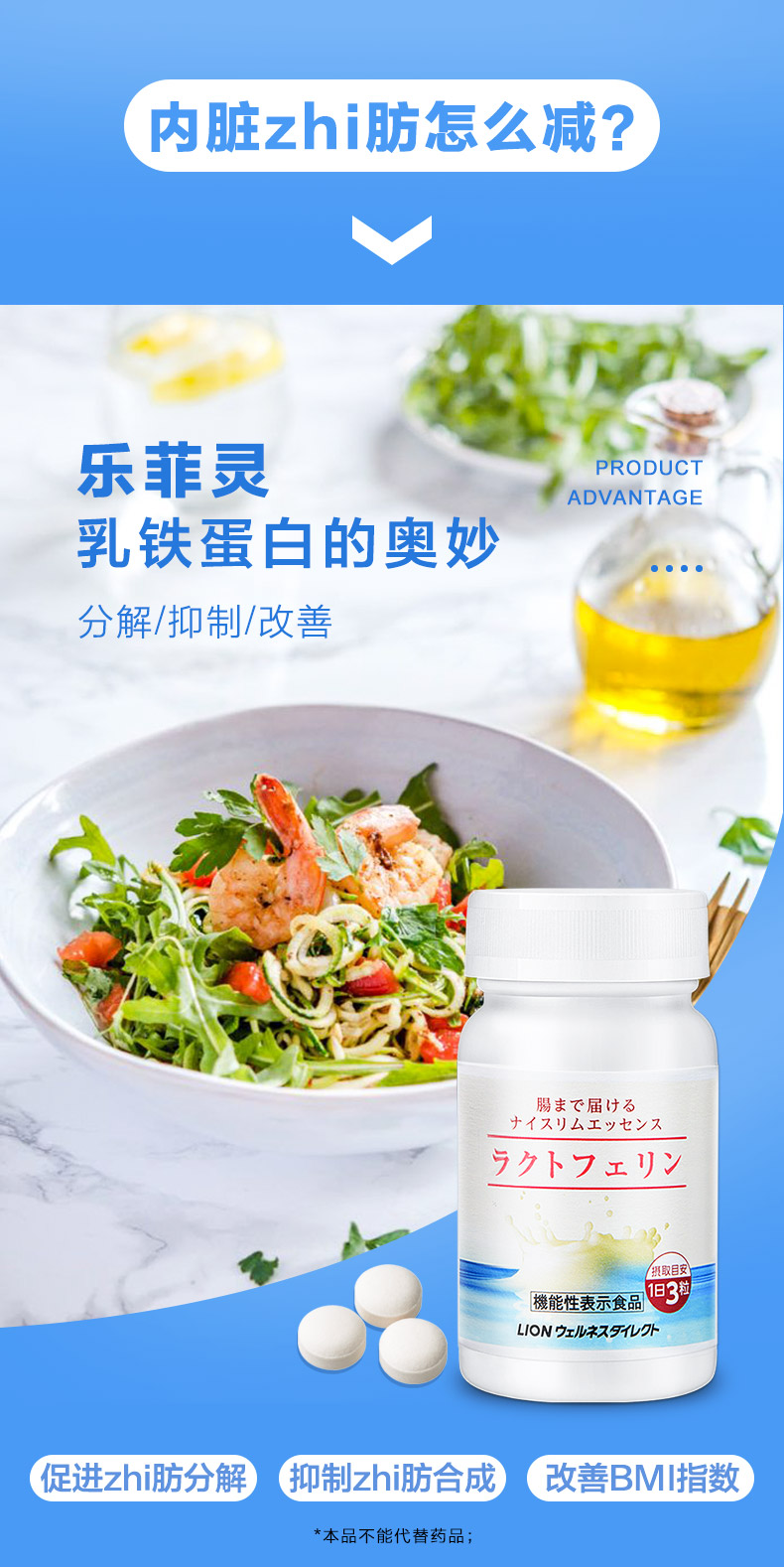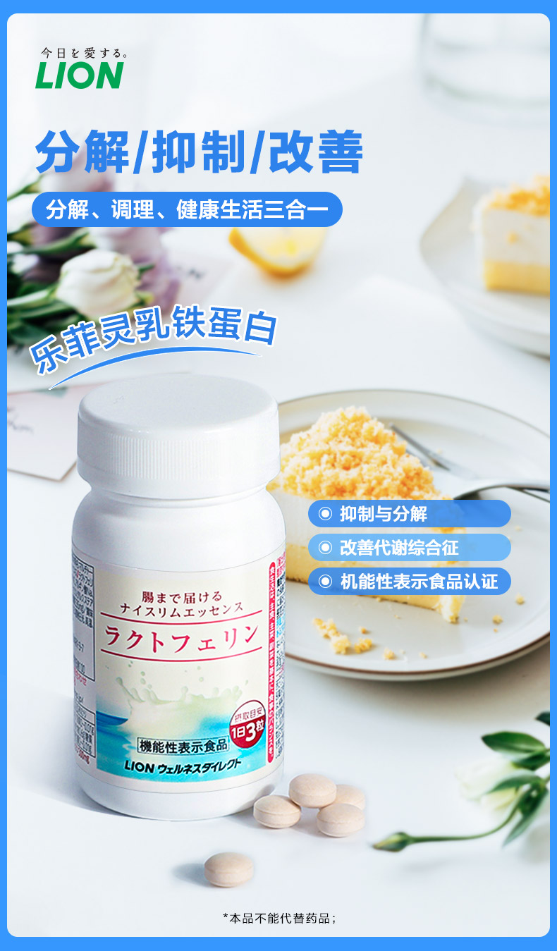 “乳铁蛋白”为日本狮王率先发现实验证明,并通过独特技术独立研发制成了“乐菲灵”。一般情况下,即使摄入了,也会被胃酸和消化酵素在到达肠道之前就会被分解掉,狮王采用其独家涂层技术,保证乳铁蛋白在胃酸中不被溶解,成功送达肠道,针对肠道周围脂肪细胞,并作用内脏脂肪细胞,促进分解,并抑制合成。