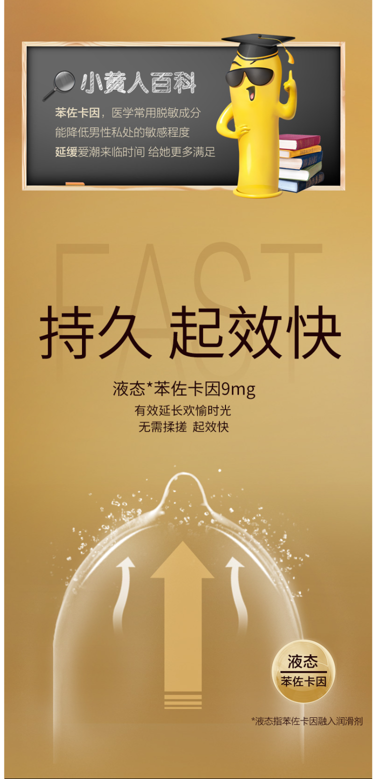超凡持久款含12mg的苯佐卡因成分,见效快,效果好,更持久。苯佐卡因是医学上常用的脱敏成分,能降低男性的敏感程度。采用天然优质乳胶材料,精密检测确保只用优质原材料,直壁光面设计,紧致贴合,添加有适量医用水润润滑剂,无阻塞感,无香,宽度53mm。