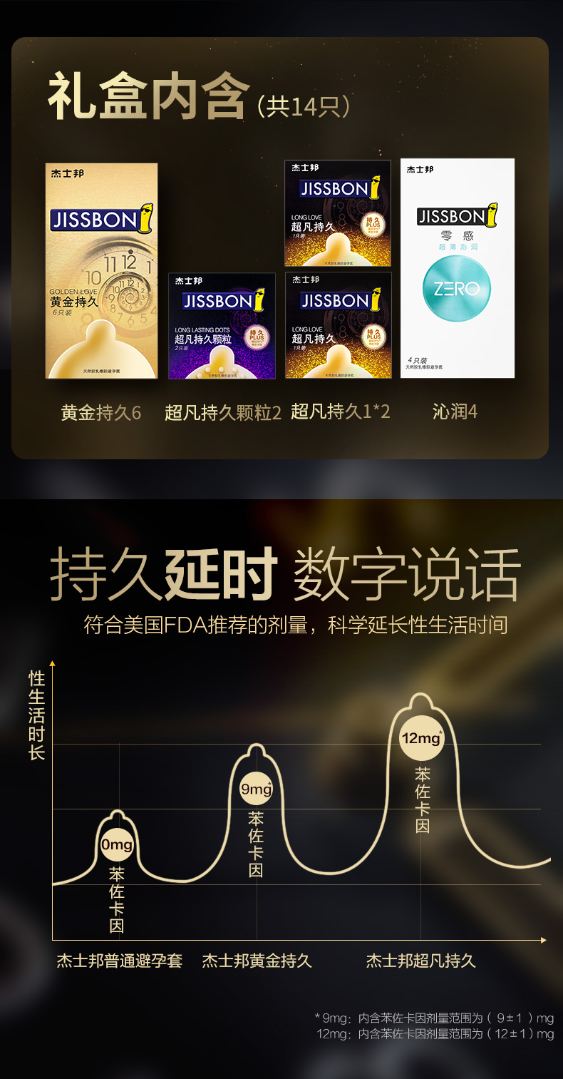 黄金持久 延时防早泄 超薄情趣礼盒。包含:黄金持久 6只、超凡持久颗粒 2只、超凡持久 1只*2、沁润零感 4只。