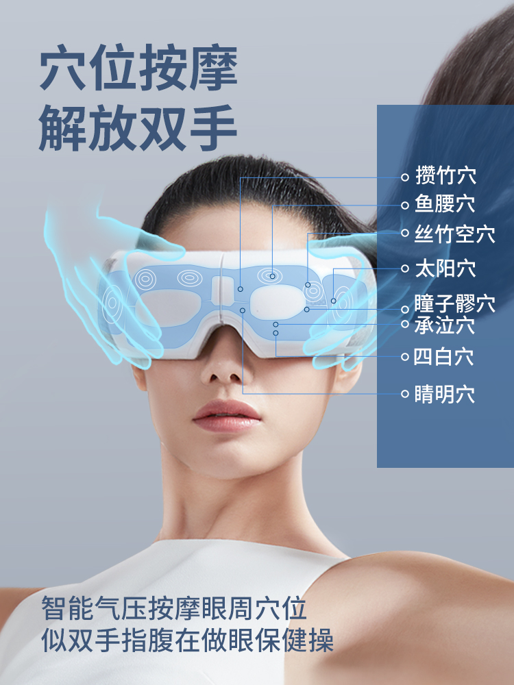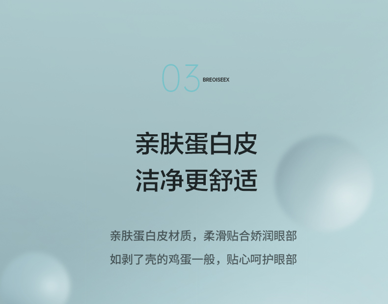 采用新一代气囊叠加技术,6个气囊温柔包裹眼部,轻轻按摩,精准按摩穴位,适用于多种脸型,充分释放眼疲劳,内层为亲肤蛋白材质,如同剥了壳鸡蛋般柔滑,呵护眼部娇嫩肌肤。