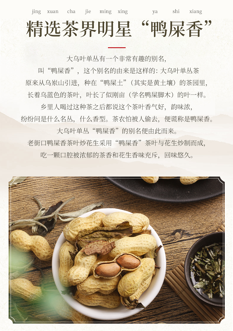 • 茶界明星“鸭屎香” 花生配好茶,做法考究,经过长达30分钟文火慢煮,茶香浸透果仁,香气醇和,味道咸甘,给花生添一份醇香,然后烘干,口感酥脆美味,妙不可言。