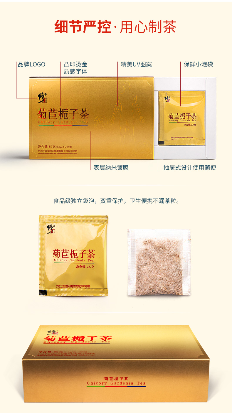 百年修正 菊苣栀子茶,精选新疆·阿勒泰 菊苣根、河南·唐河县 栀子、广西·藤县 葛根、四川·宁南县 桑叶、安徽·霍山 百合(按4:3:2:0.5:0.5科学黄金配比)、经过反复试验,不同材料研磨不同的粗细程度,使浸泡时析出快速全面,汤色澄亮,有淡淡清香,入口温和绵柔。食品级独立包装,双层保护,卫生便携。