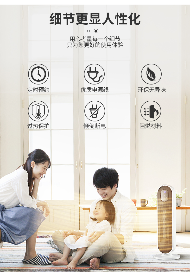 暖风机带有防尘网设计,取暖送风无灰尘;出风口金属密集网孔设计,家有小孩也可放心使用,塔式设计小巧不占地。使用更方便。