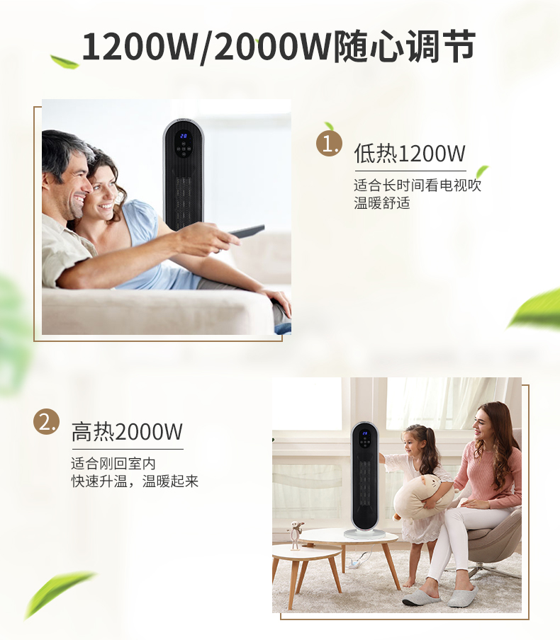 1200w/2000w两档可调。采用PTC陶瓷发热体,无明火无光不耗氧,发热快,温感舒适不干燥,可左右70度广角送风,内置双重过热保护开关,度过高自动断电,倾倒自动断电。使用安全放心。