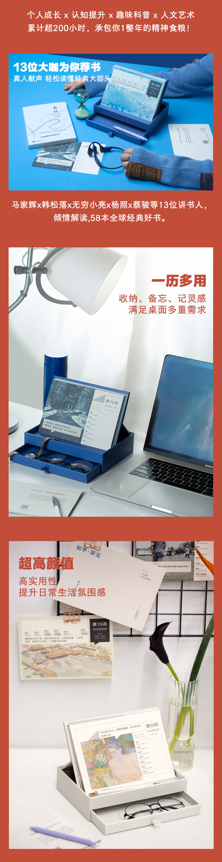 天猫知乎图书旗舰店78元,可领10元优惠券,实付68元到手,可以听的周历,赠53门课程免费听,累计超过200小时,一个知识和桌面的双重收纳盒。
