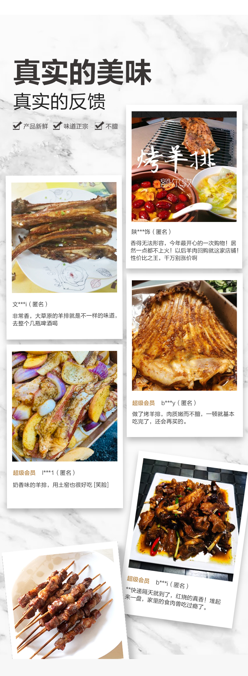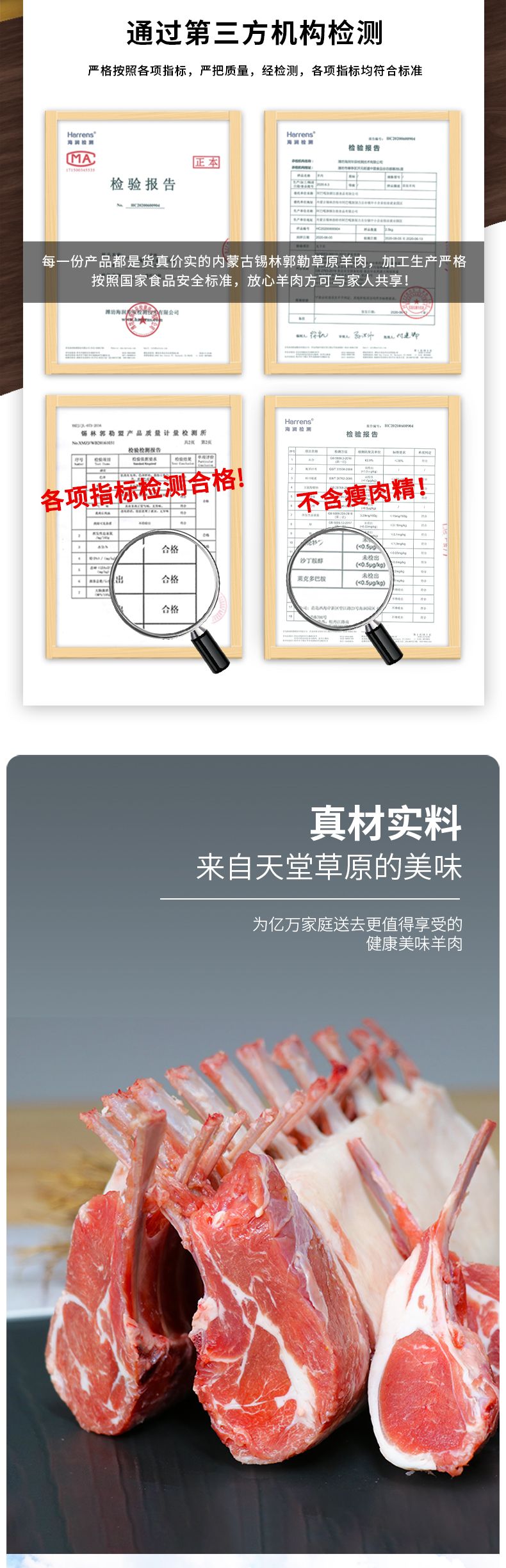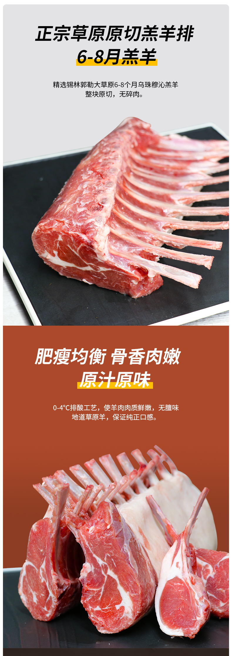 这款法式羊排,锡林郭勒盟产品质量管理体系认证。正宗锡盟草原散养羔羊,精选具备法式特色的12肋排部位,骨小肉多,肉质细嫩,羊脂均匀,肥瘦结合,羊肉味道香浓,膻味小,非常适合适合制作法式煎羊排、烤羊排。