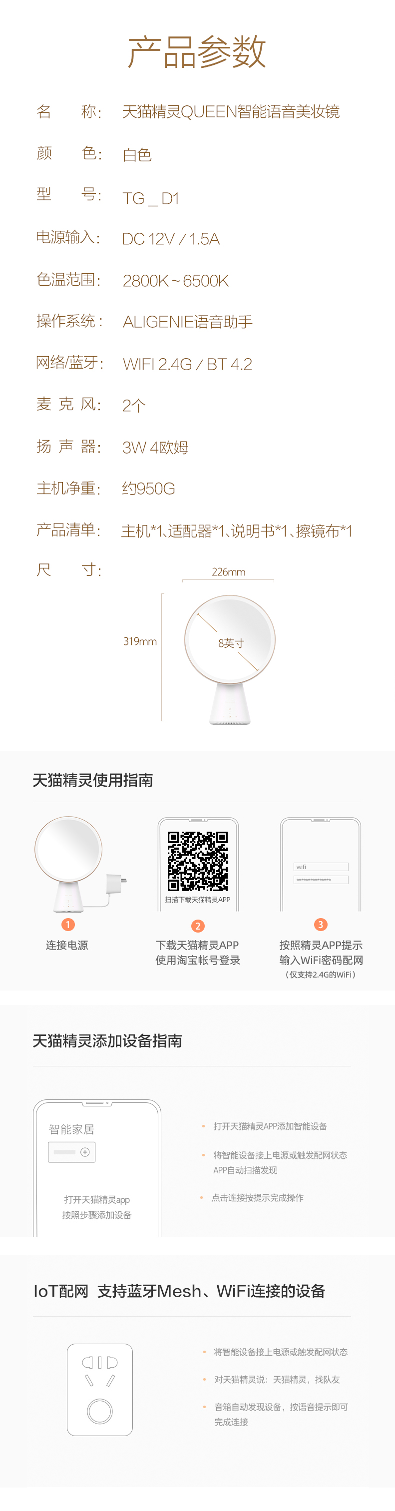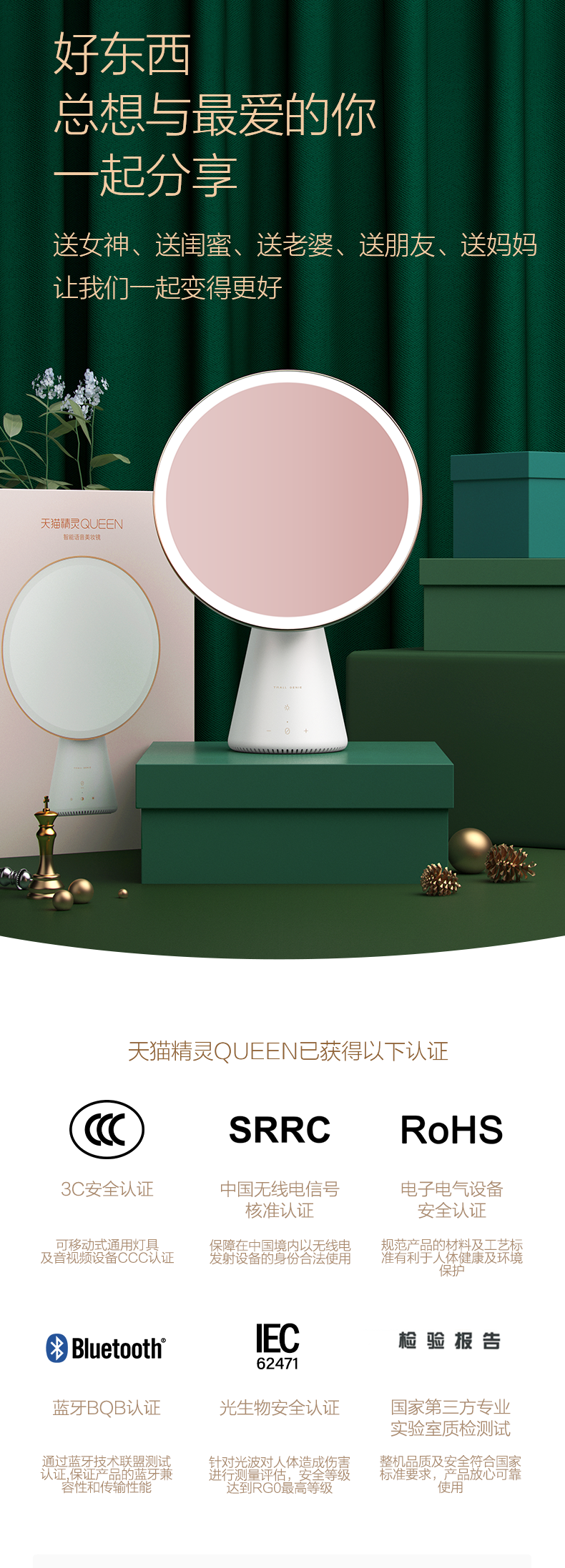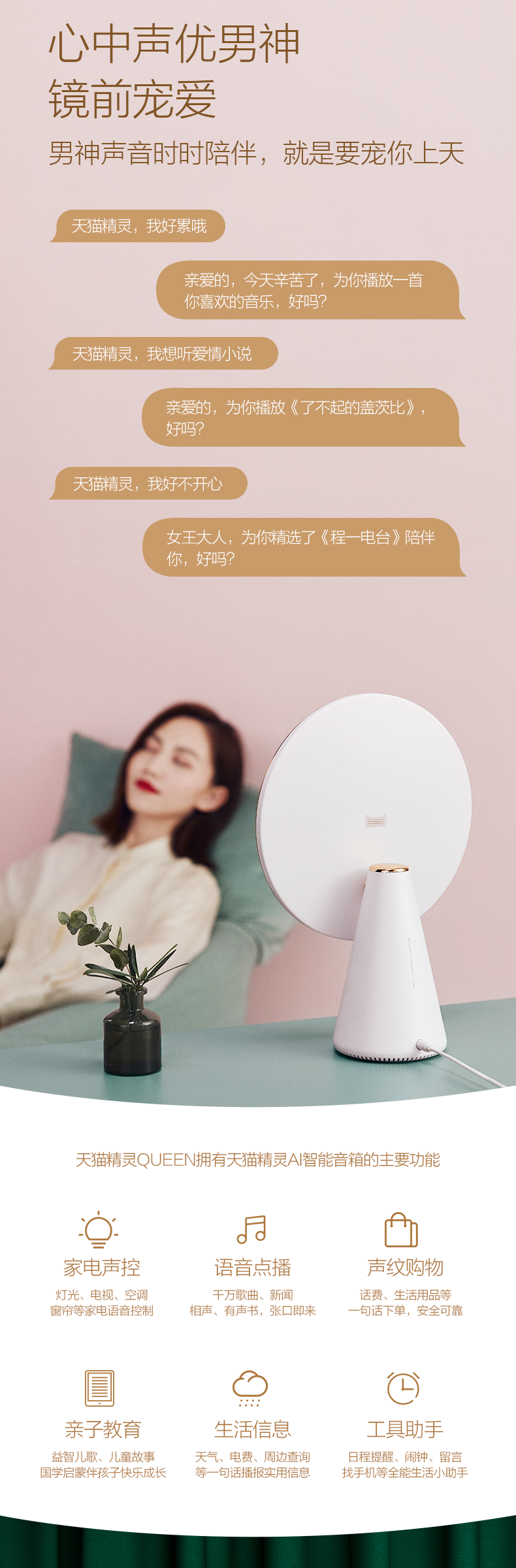 天猫精灵 QUEEN 智能美妆镜,采用经典几何造型,曲面优美,8英寸高清抗污镜面,专业美妆级光源,模拟自然光源、还原准确妆容。智能语音无级调节亮度,镜面角度自由调节,还可学习化妆护理知识,美护提醒,时刻关爱,女神之选。