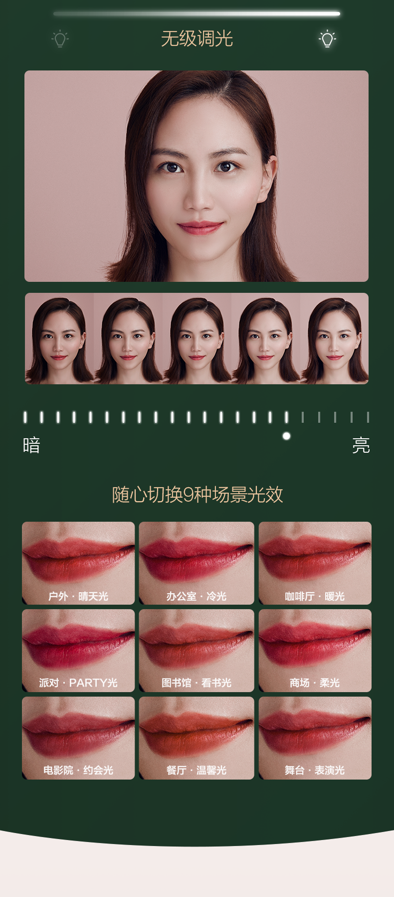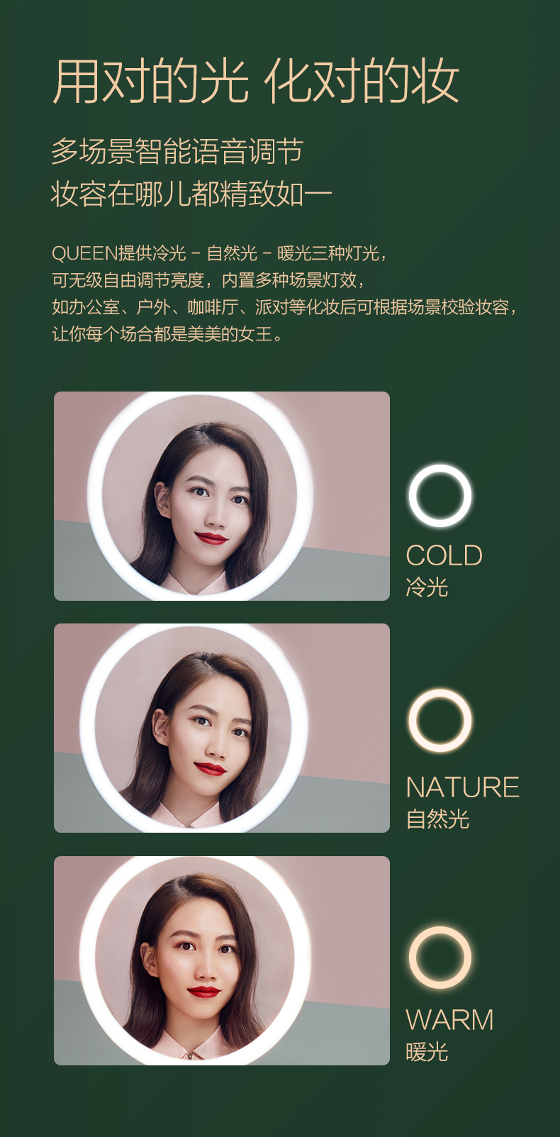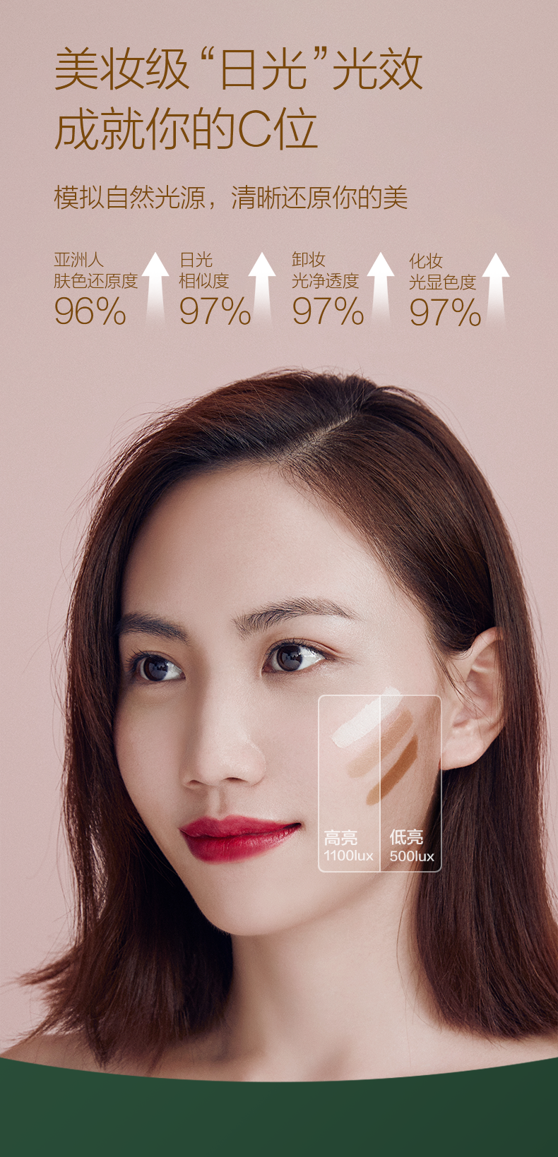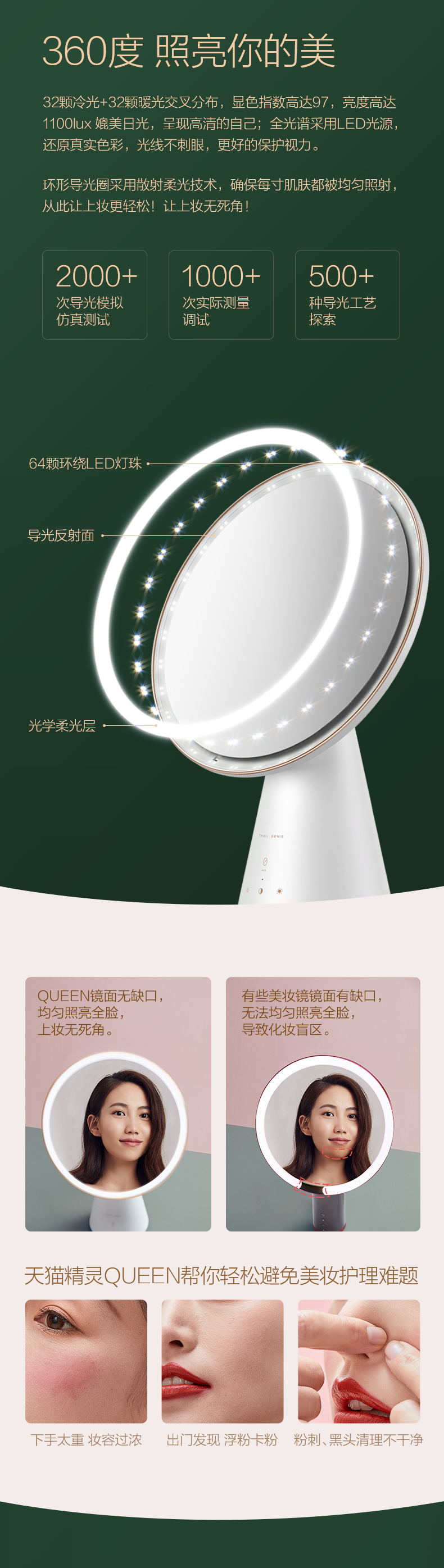 采用64颗专业美妆级灯珠,其中32颗冷光+32颗暖光交叉分布,显色指数高达97,亮度高达1100lux媲美日光,呈现高清的自己;全光谱采用LED光源,还原真实色彩,光线不刺眼,环形导光圈采用散射柔光技术,确保每寸肌肤都被均匀照射,上妆更轻松无死角。