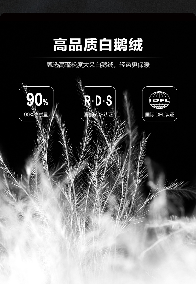 内充优质大绒朵白鹅绒,国际RDS+IDFL双重认证,90%含绒量、真正的高品质放心绒。充绒量100-150g,蓬松轻盈,在加上衣服内层银点蓄热科技,蓄热保暖同时最大化减轻了整衣重量穿着不厚重。