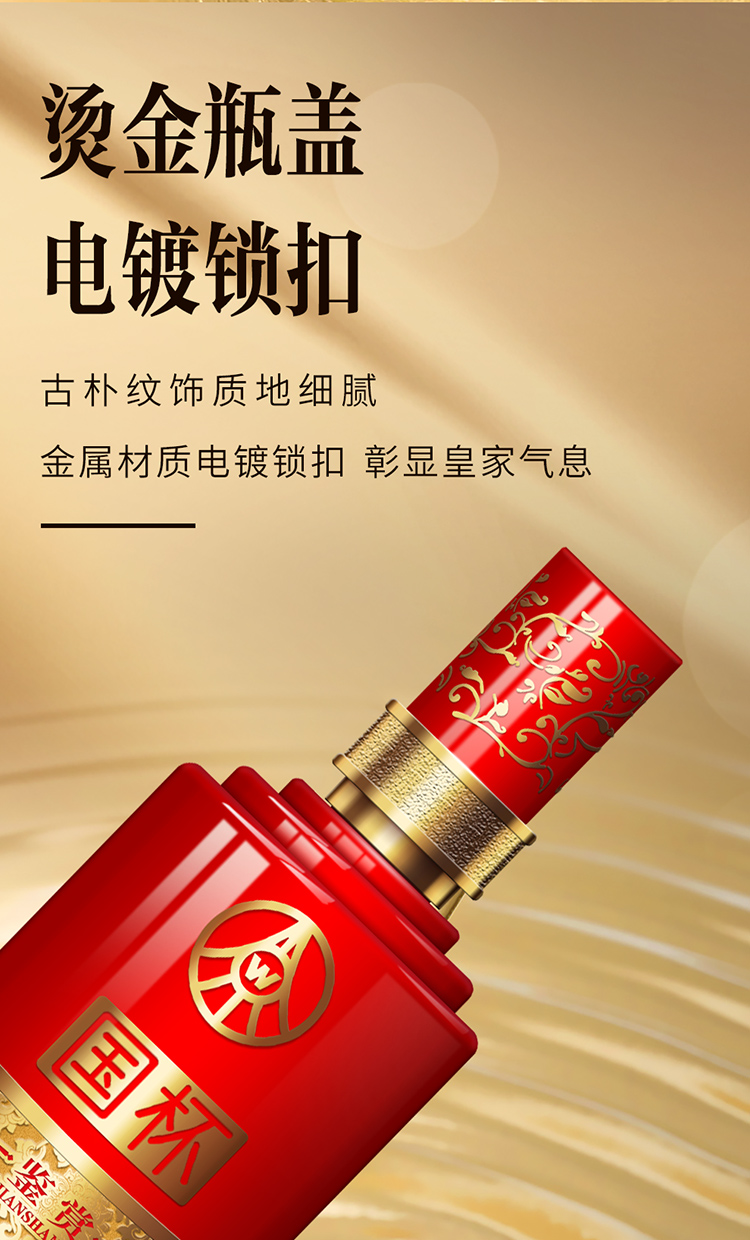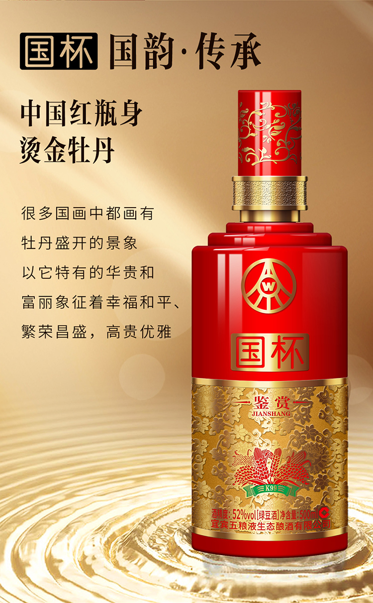 中国红瓶身+烫金牡丹盛开景象的设计,彰显华贵和富丽象征幸福和平、繁荣昌盛,与金色亚克力外盒与瓶身交相辉映,彰显大气,高端典雅,扫码价498元。