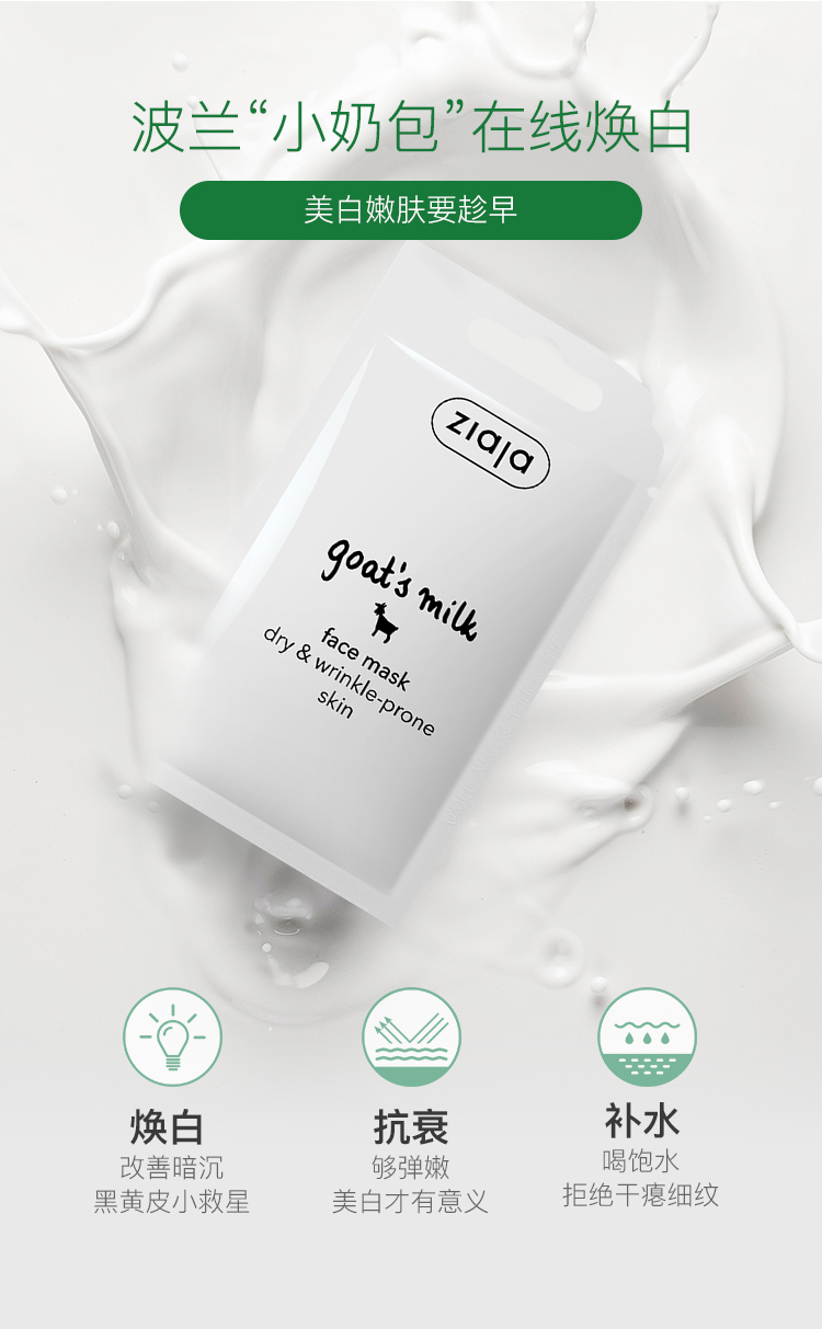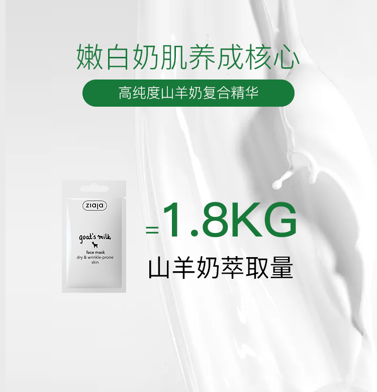 羊奶中含丰富的EGF因子(上皮细胞生长因子),有明显的美白肌肤,保湿平皱的作用,ziaja山羊奶面膜除了补水,更能深入滋养肌底,修复老化、坏死、磨损的上皮细胞,并促进皮肤弹性形成,使皮肤美白,达到补水之中自然抗衰老的效果。