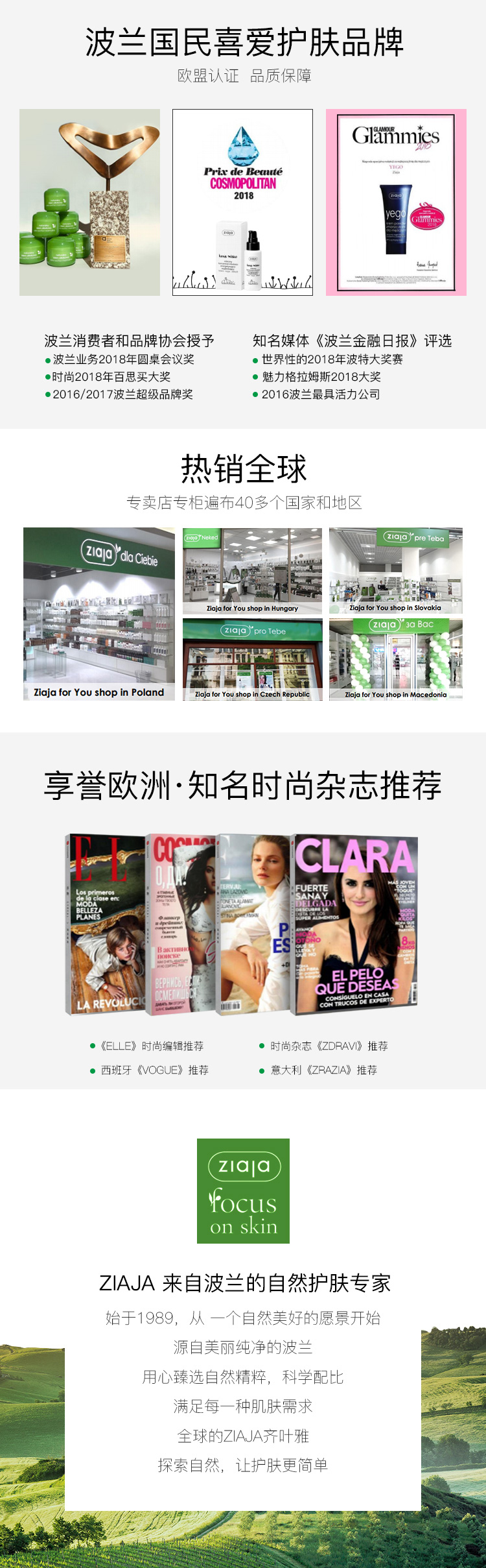 主打纯天然理念的ziaja是波兰第一的国民品牌,一举获得2016波兰超级品牌奖、2016波兰最具活力公司荣誉和ELLE 2016全球美妆创新大奖。山羊奶面膜作为全品牌的N0.1明星产品,成为欧洲面膜销量的龙头代表。