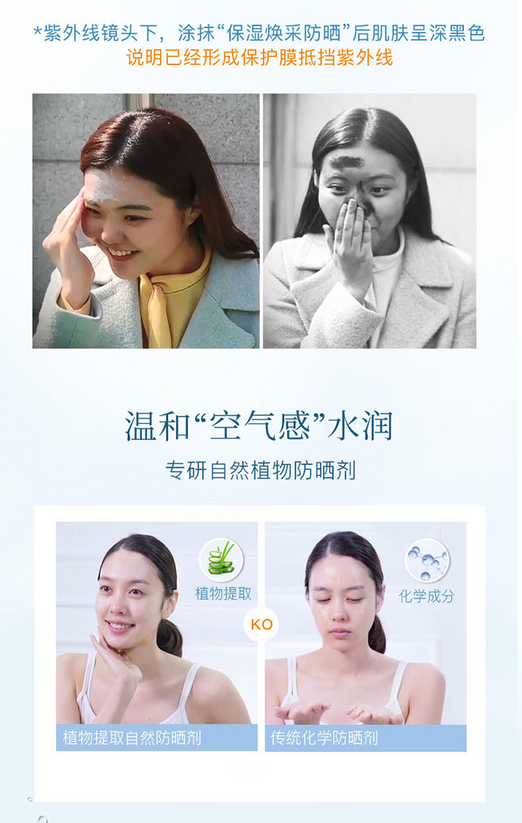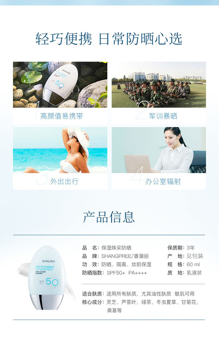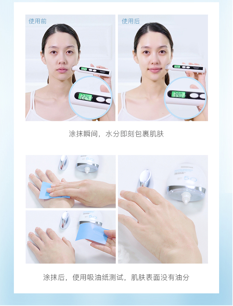 使用轻薄隐形,清爽不油腻,还含有丰富的保湿成分,瞬间提升肌肤含水量,其中虫草和灵芝成分促进肌肤晒后自我修复功能,令肌肤晒后依然保持健康透亮;让您尽情享受阳光乐趣。