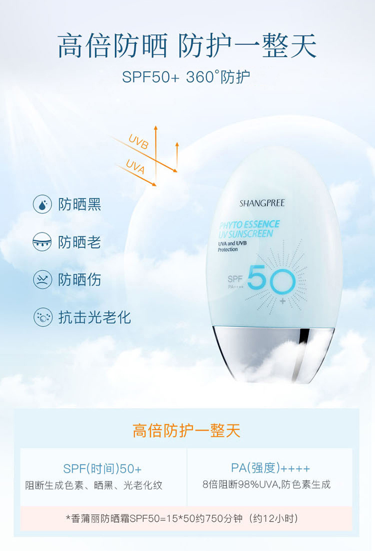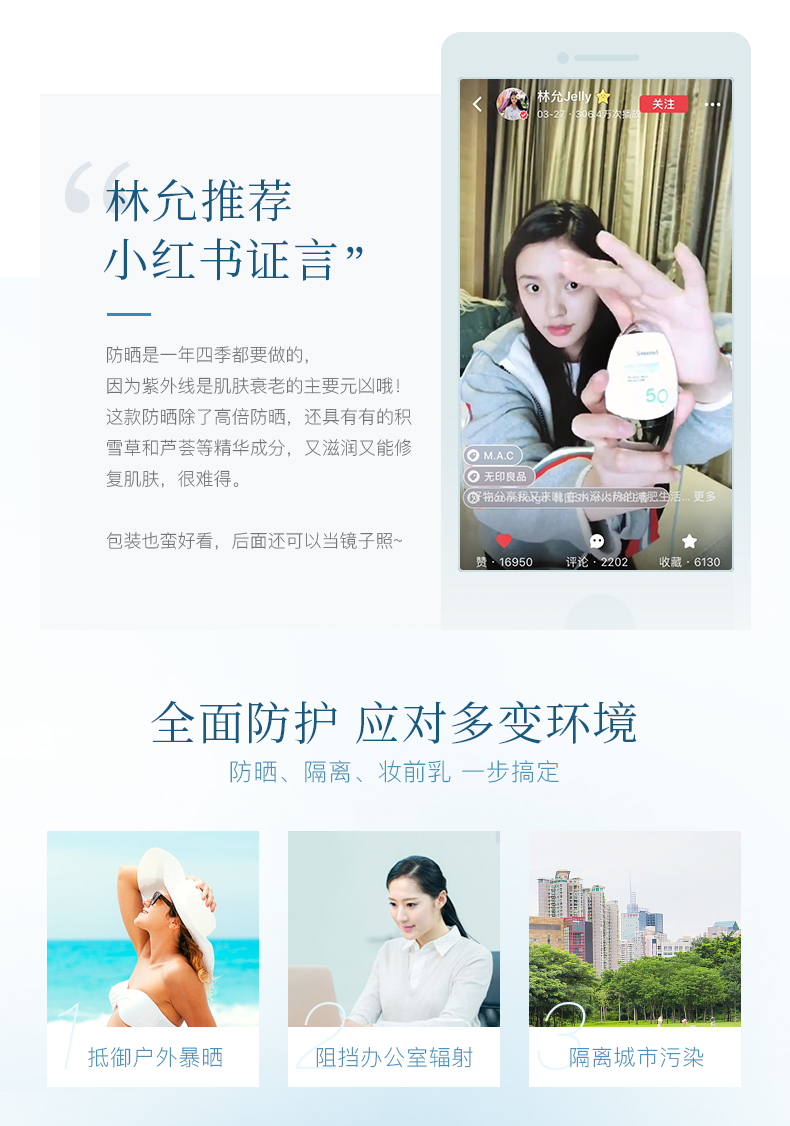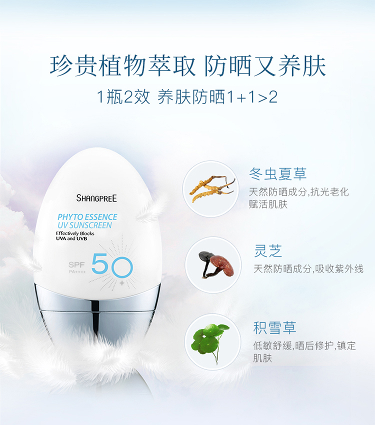 韩国原装进口,连续3年斩获K-Beauty金奖,林允、薇娅小红书推荐,天然植物精粹,提取虫草、灵芝、库拉索芦荟、黑豆等21珍贵植物,舒缓抗敏,防晒指数SPF50+,全面抵御紫外线(UVA、UVB)预防黑色素,持久防护可达12小时。