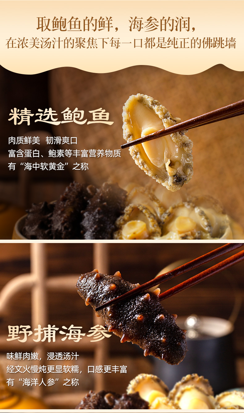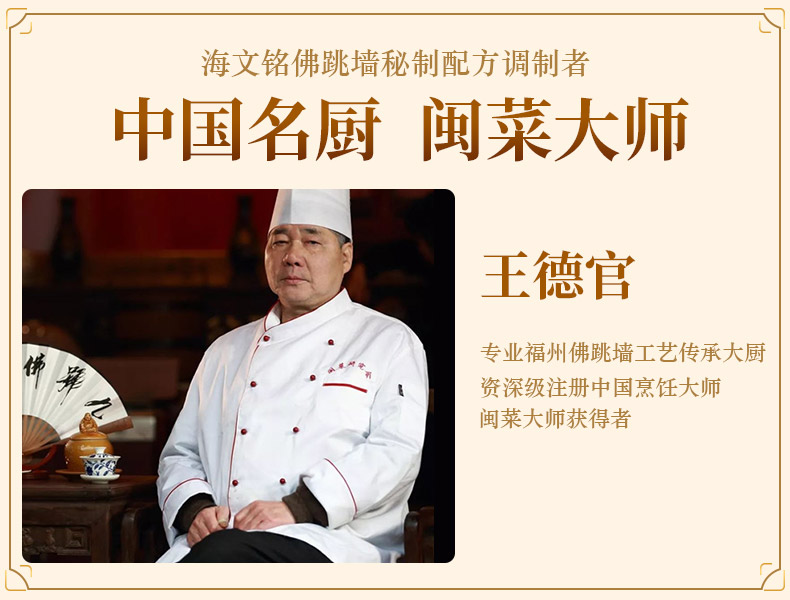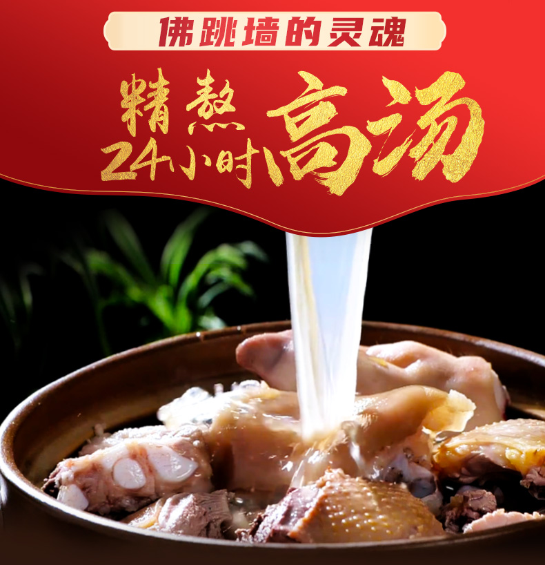 中国闽菜大厨王德官秘制,15种食材 24时文火熬制。包含:福建鲍鱼、海参、深海花胶、柔鱼、猪蹄筋、鲍螺片、素鱼翅、香菇、杏鲍菇等、加上精选散养士鸡、番鸭上排、筒骨、大腿骨、猪蹄、金华火腿、鸡爪等优质原料,慢火24小时熬制金汤,加热即食,营养滋补,无添加剂,食品级蒸煮袋装,加热即食非常方便。